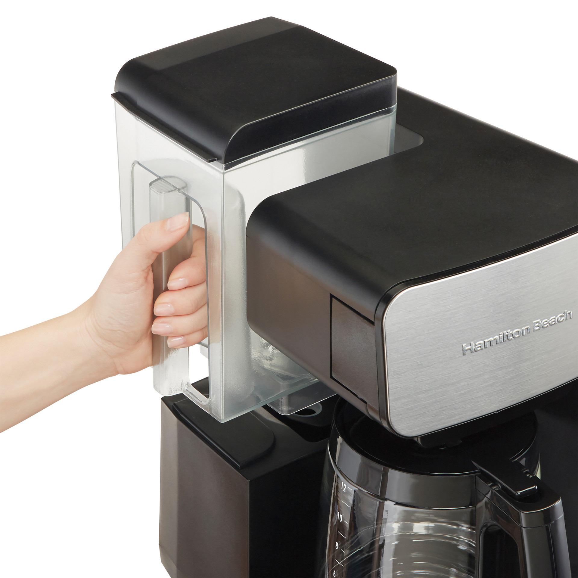 With a generous 12-cup capacity, the Hamilton Beach Easy Access Ultra programmable coffee maker is designed for effortless filling. The front-swing filter basket pivots forward so you can add coffee easily, while the removable water reservoir with built-in handle lifts out quickly for convenient refilling.