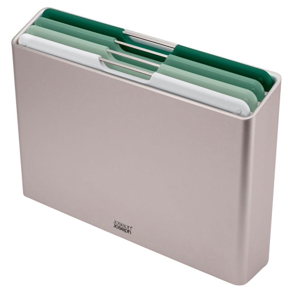 • This stunning design features a slimline, plastic case that keeps four large chopping boards beautifully organized and looks stunning on the countertop.