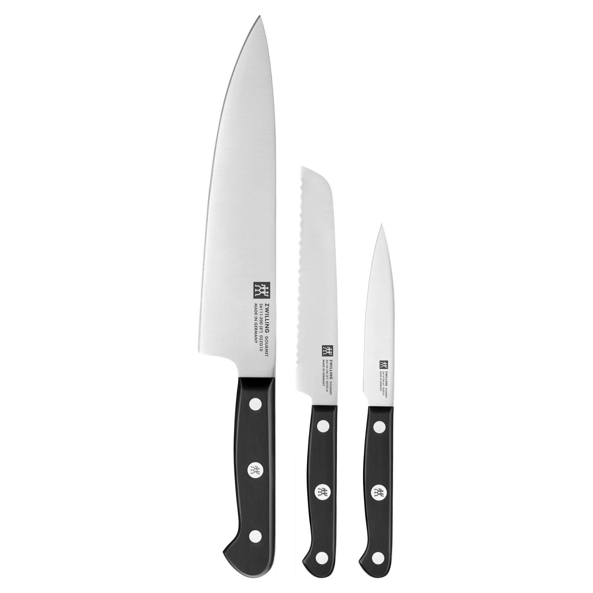 The ZWILLING Gourmet is the knife of choice for amateur chefs who want to make their everyday knife exceptional. Featuring a traditional triple-riveted design with a sturdy, balanced feel in the hand, this 3-piece set of essential kitchen workhorses designed for slicing, chopping and dicing is well engineered, reliable and built for long-lasting use.