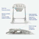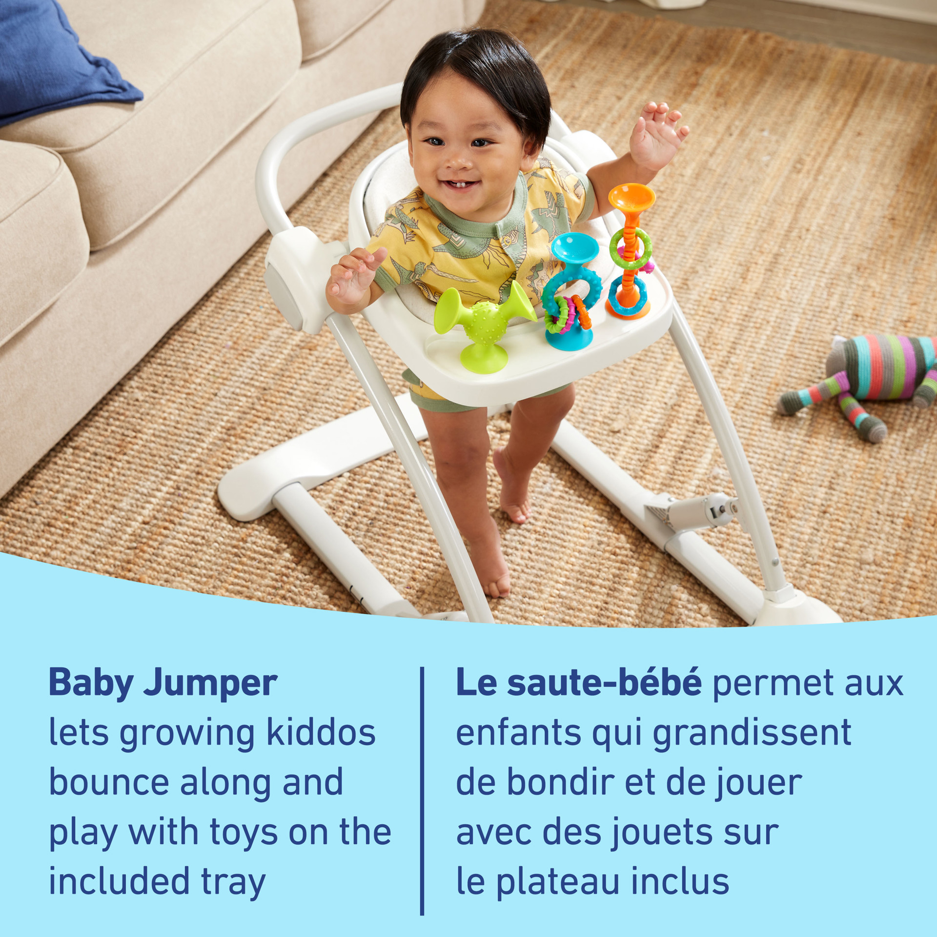The baby activity chair folds for easy storage and transport, and includes a machine-washable seat cushion for easy cleaning.