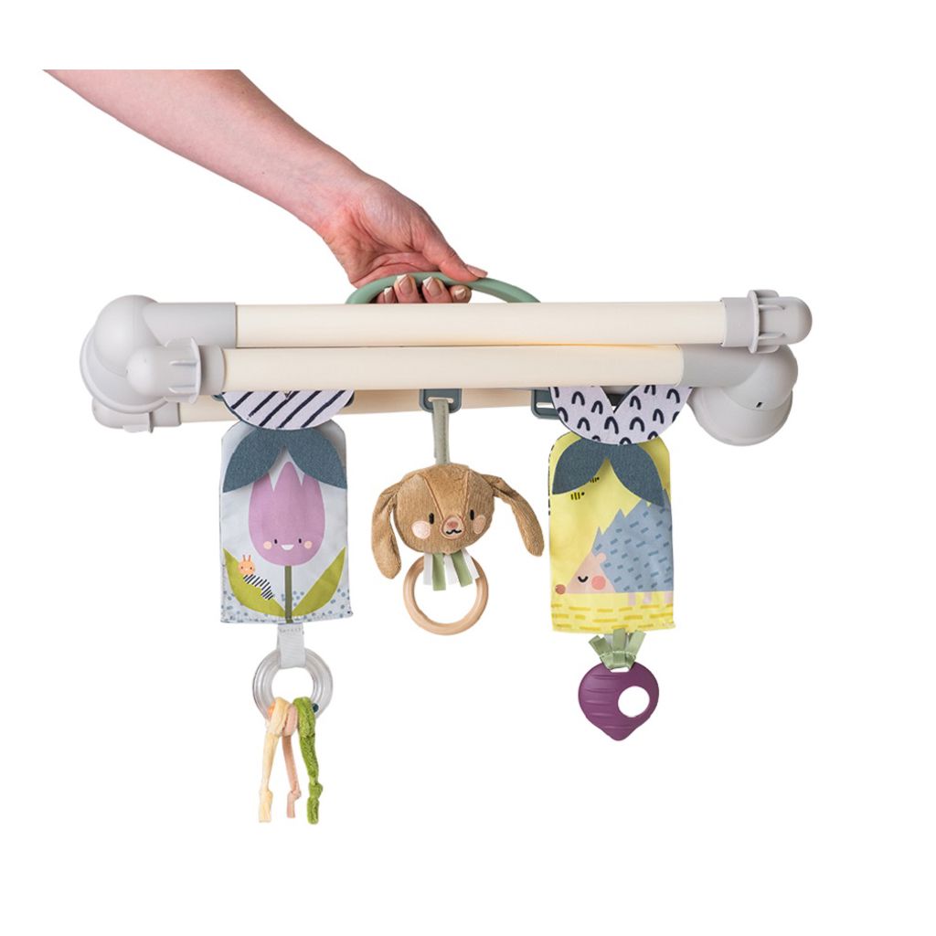 • Features 4 detachable, multi-sensory hanging toys: jingle bell Jenny bunny with colorful ribbons, 2 double sided crinkle toys with butterfly mobile on one end and a ring rattle and a beet teether on the other end, round baby-safe mirror.
