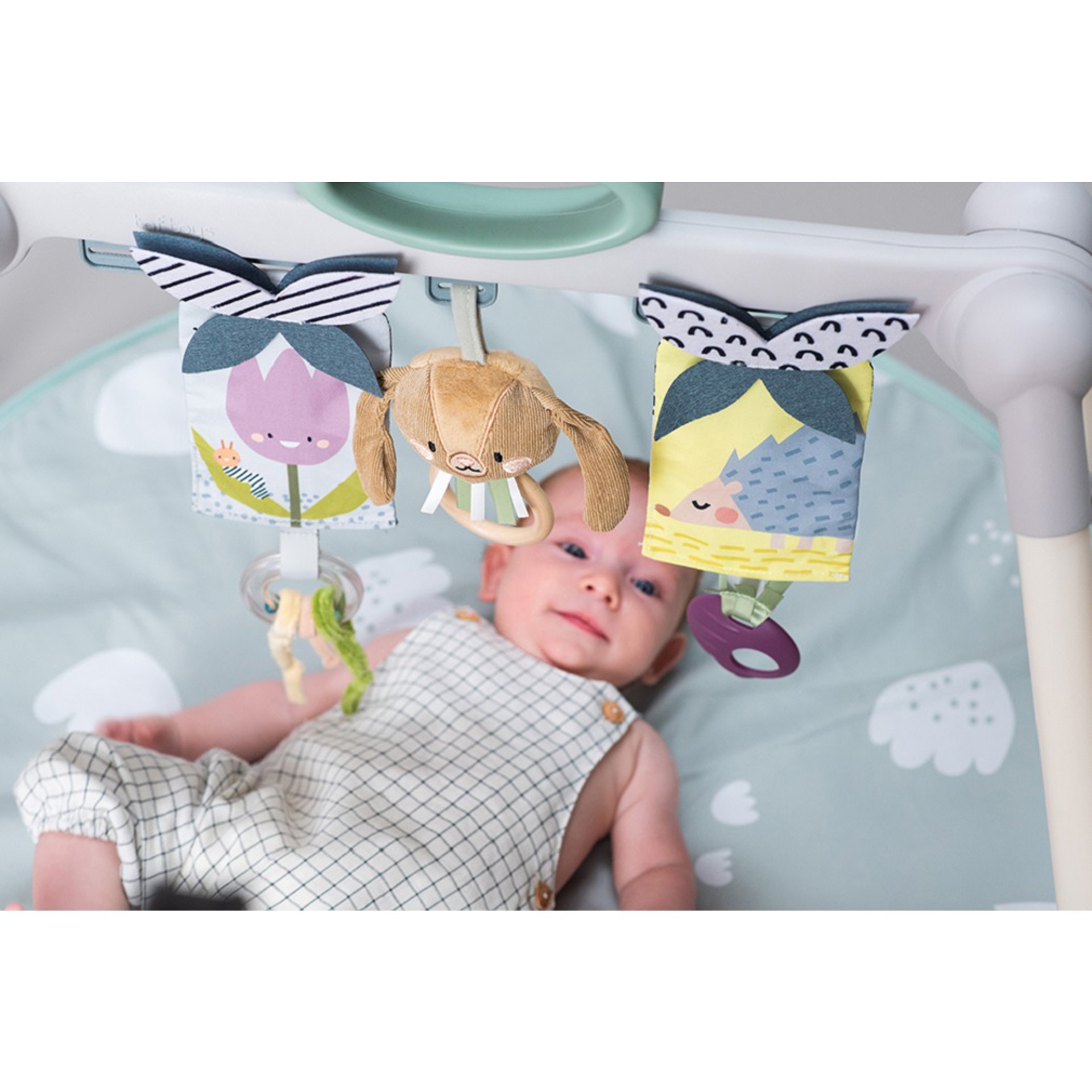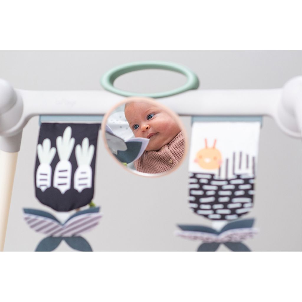 • Stylish sturdy take along baby gym with foldable legs and a padded playmat, easy to fold and carry when out and about.