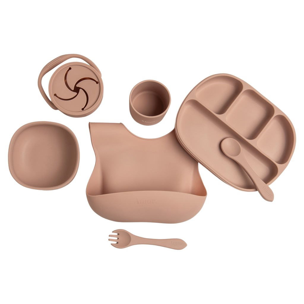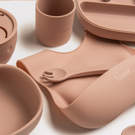 Complete silicone meal set including a glass, a bowl with suction cup, a suction plate with lid, a snack container with lid, utensils and bib.