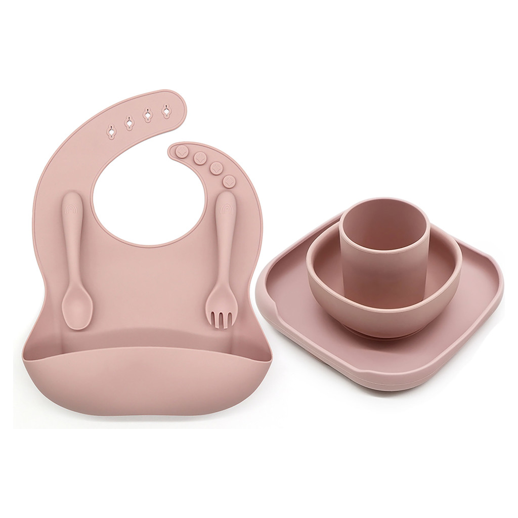Silicone meal set including 6 pieces: a glass, a bowl with suction cup, a plate with suction cup, utensils and bib.
