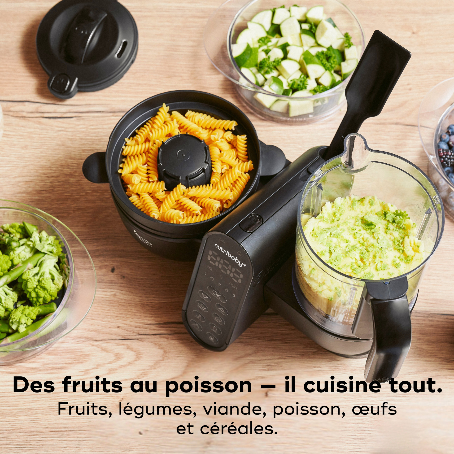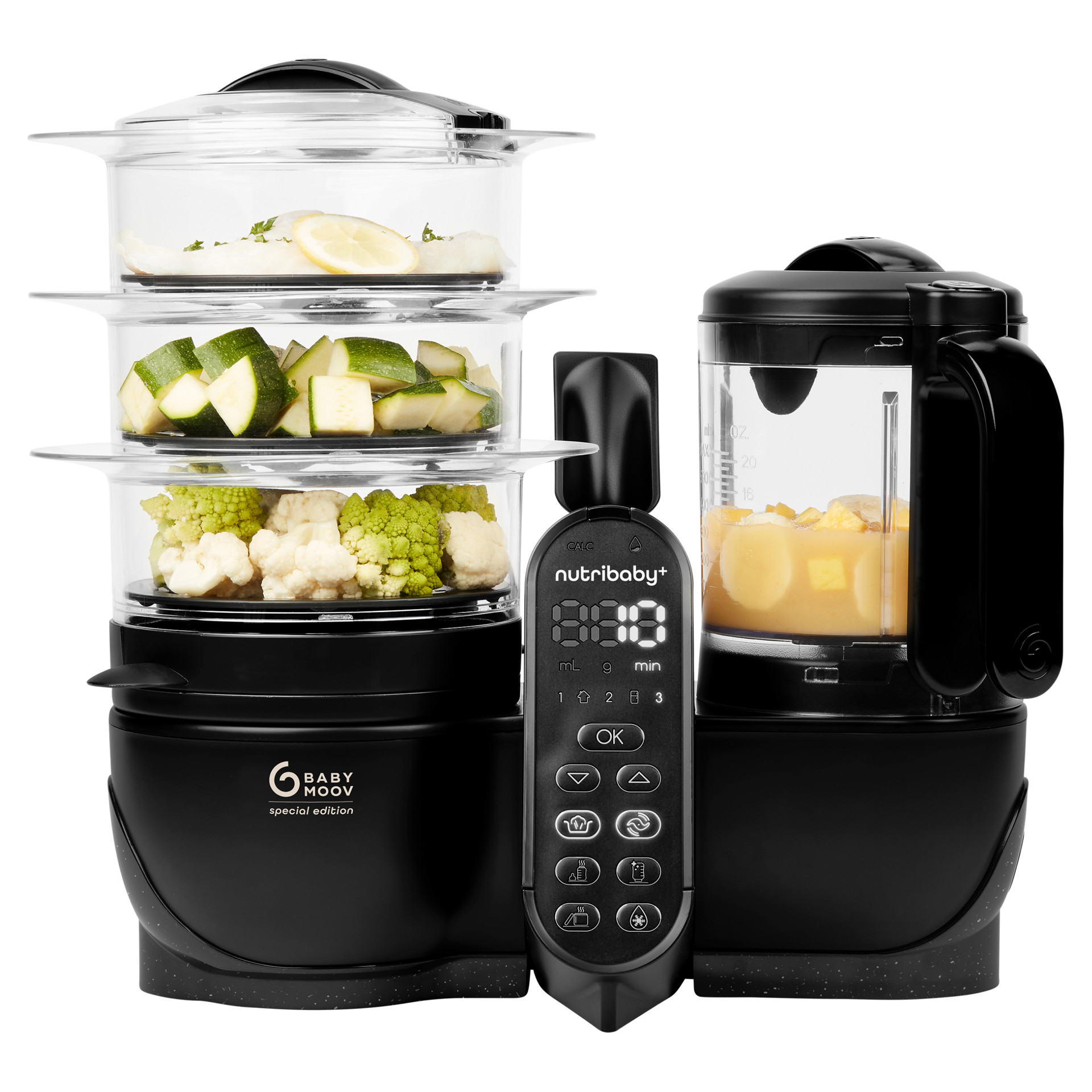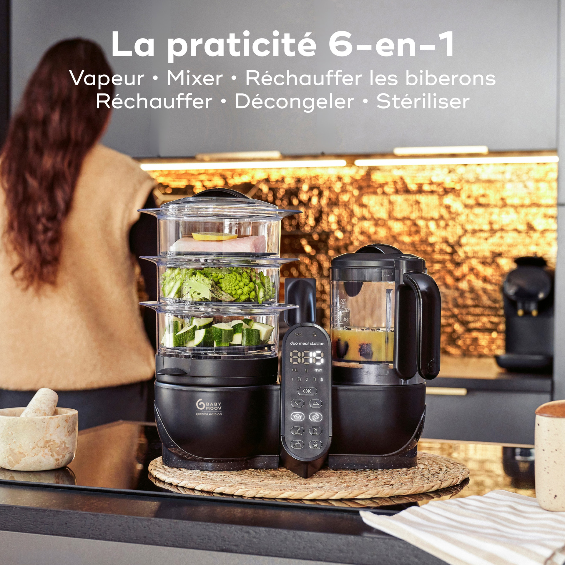 To help you prepare healthy meals while preserving essential nutrients quickly and easily, the Duo Meal Station features a central control panel with a simple one-button-per-function design. The steam baskets and blender can be used simultaneously, allowing you to steam, cook, blend, reheat, and sterilize bottles all at once.