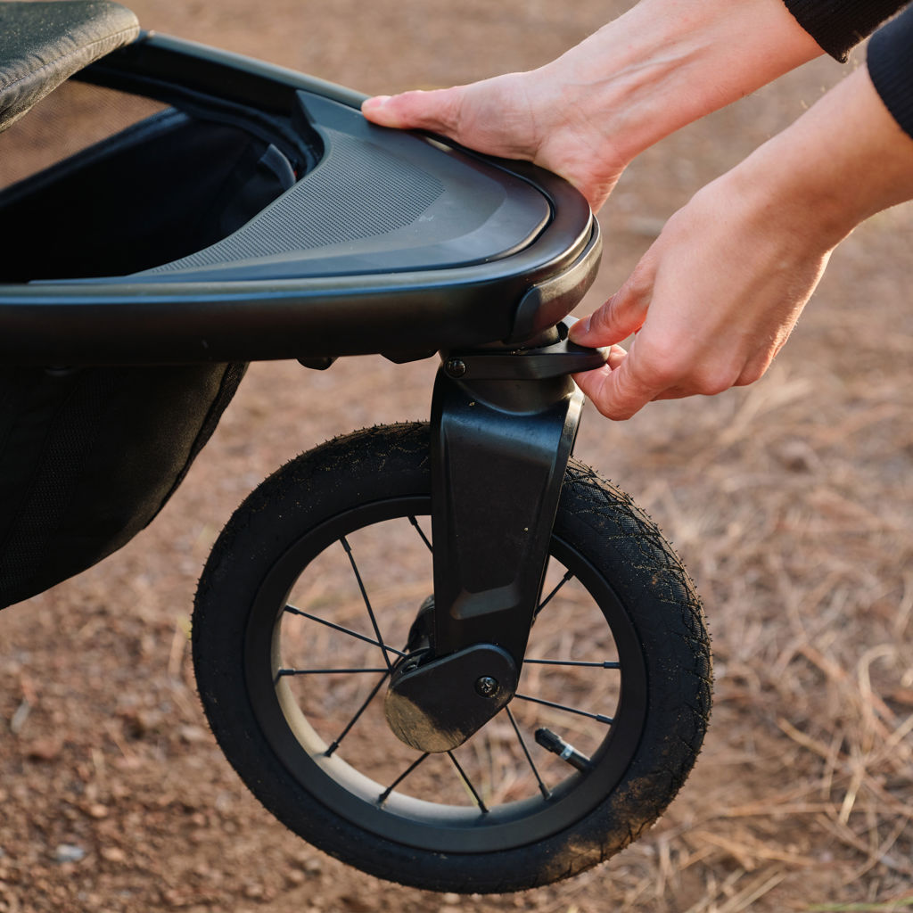 • Swivel front wheel locks easily for jogging and running