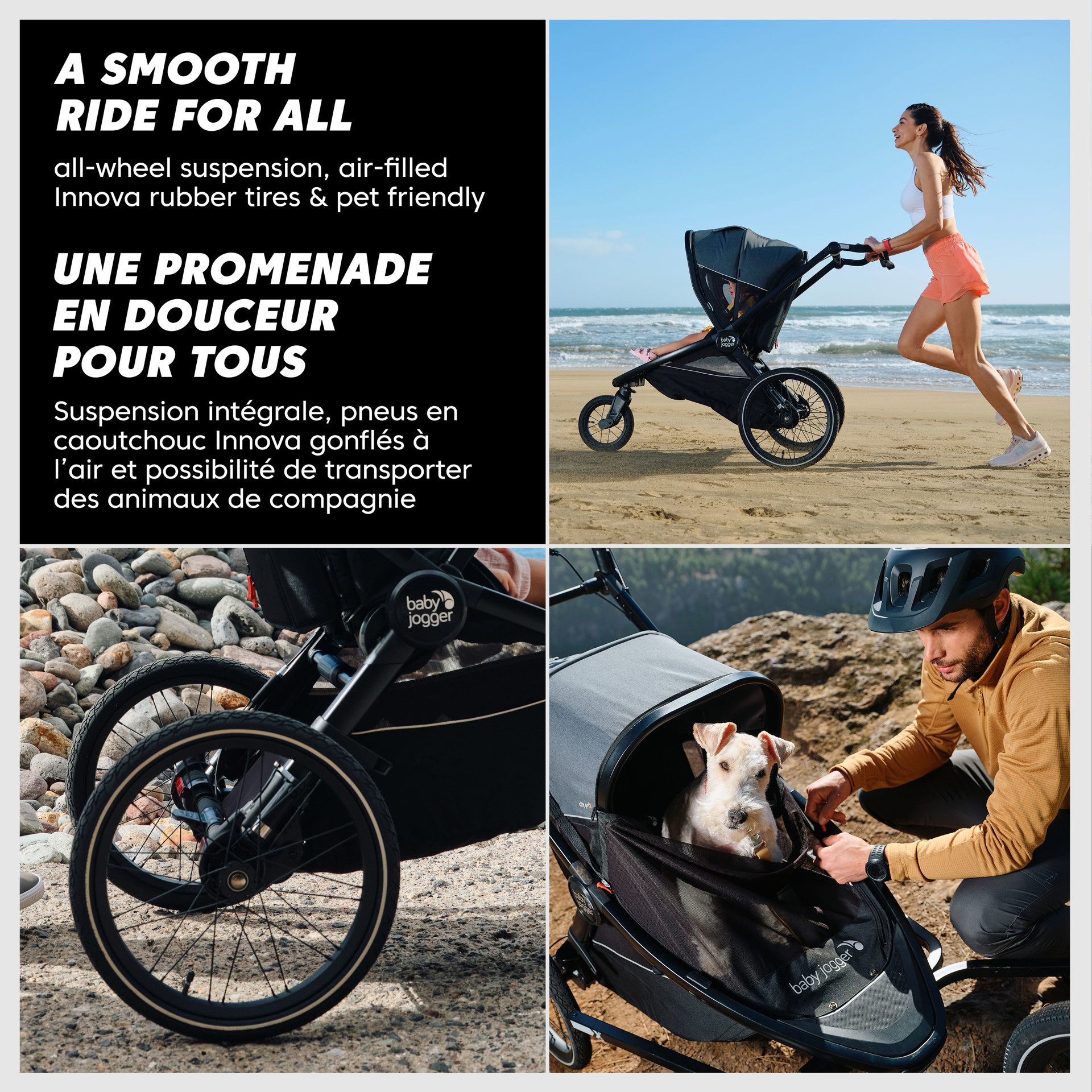 • Air-filled Innova rubber tires provide a smooth ride, whether walking, jogging or cycling over any terrain