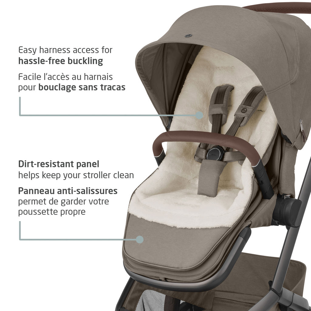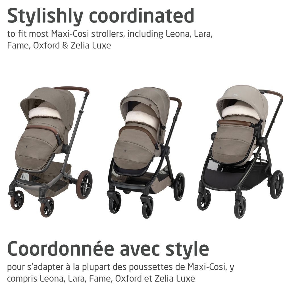 It stays on while folding and fits most Maxi-Cosi strollers, adding a perfect colour match and extra comfort with every ride.