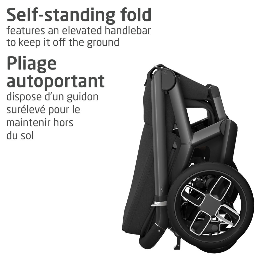 The Fame stroller folds compactly and stands on its own, regardless of seat position, making storage easy at home or on the go.