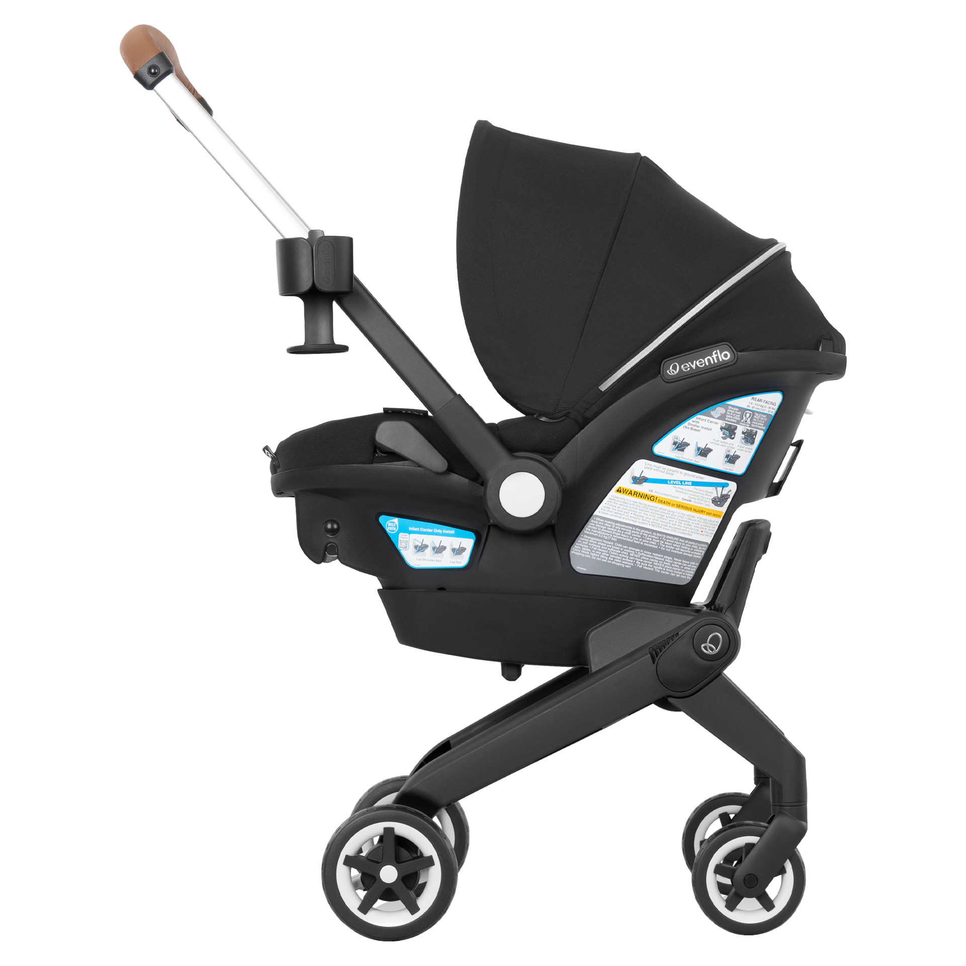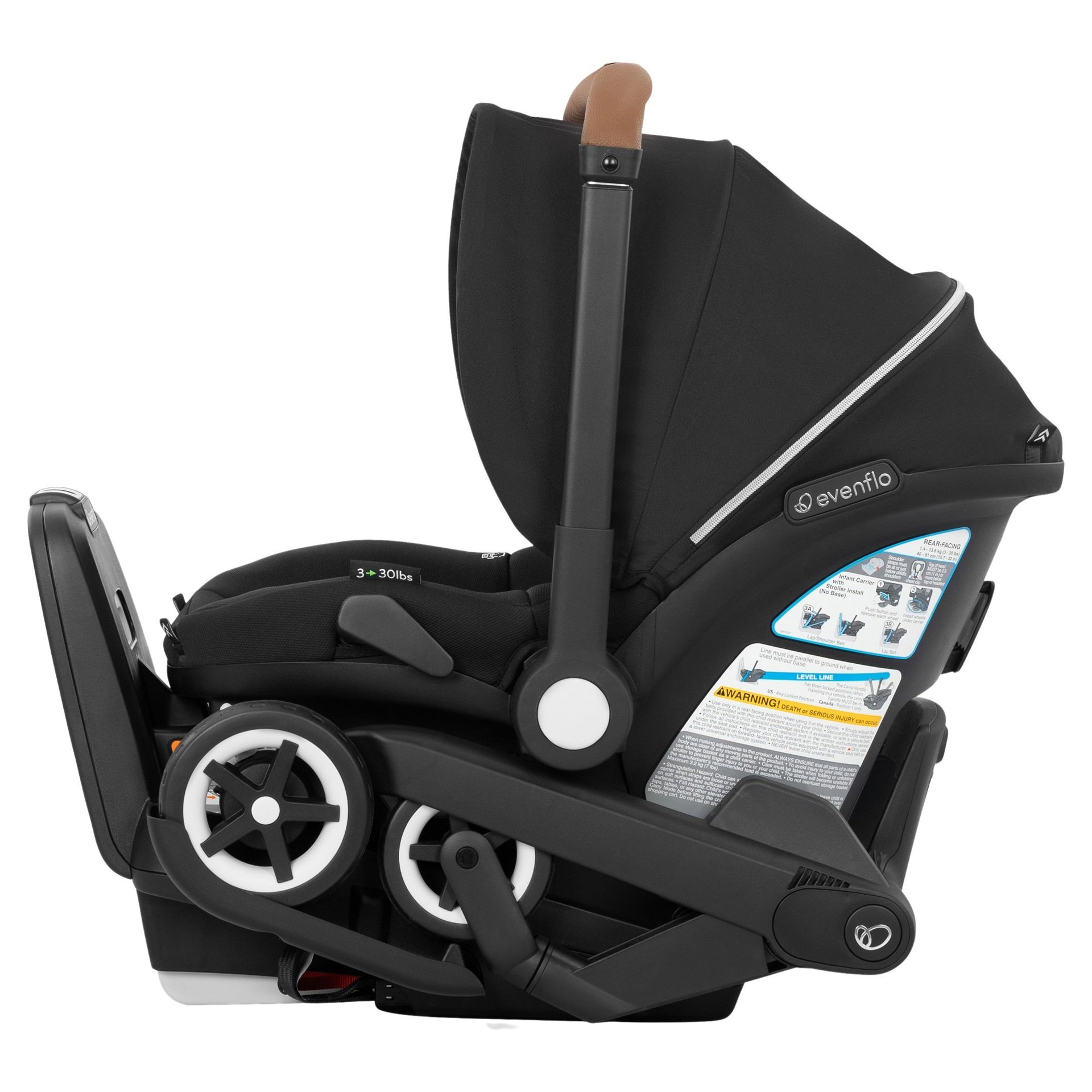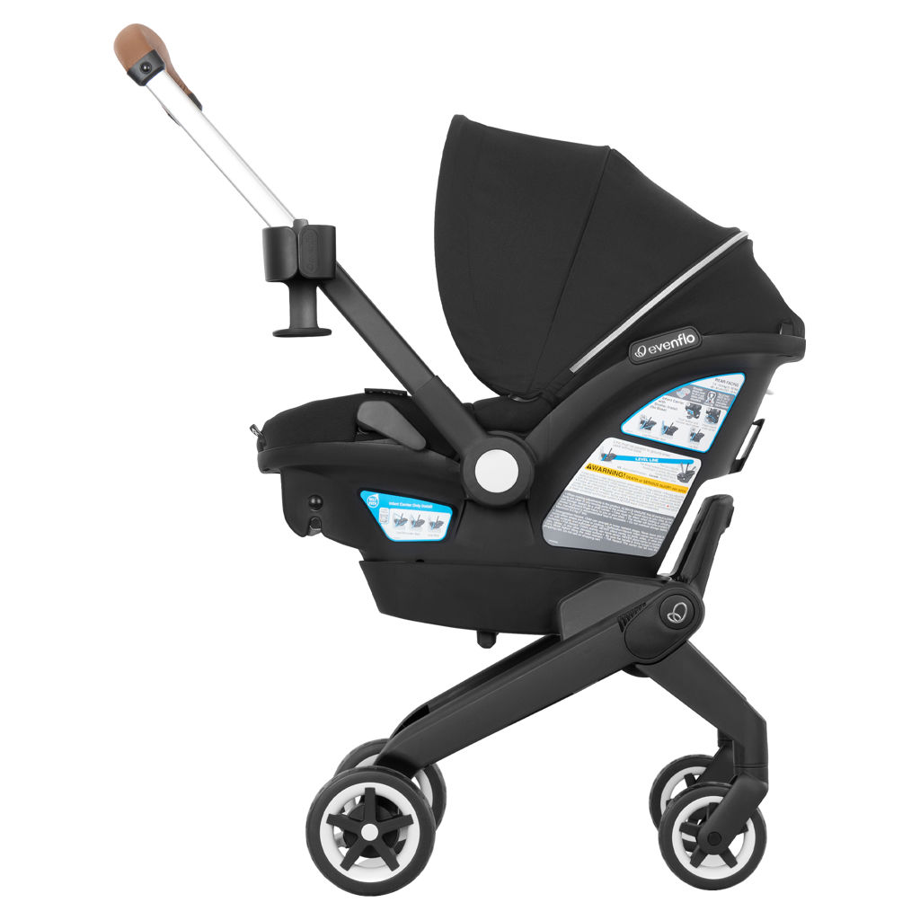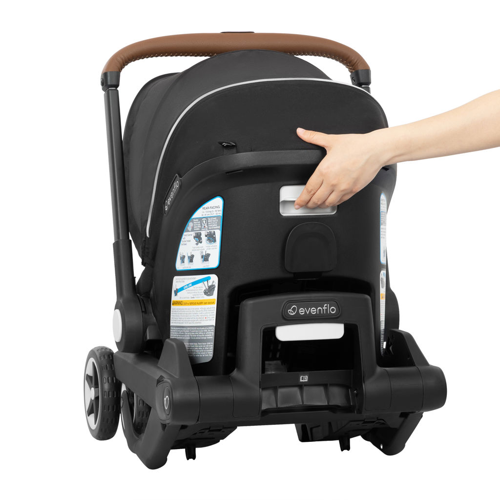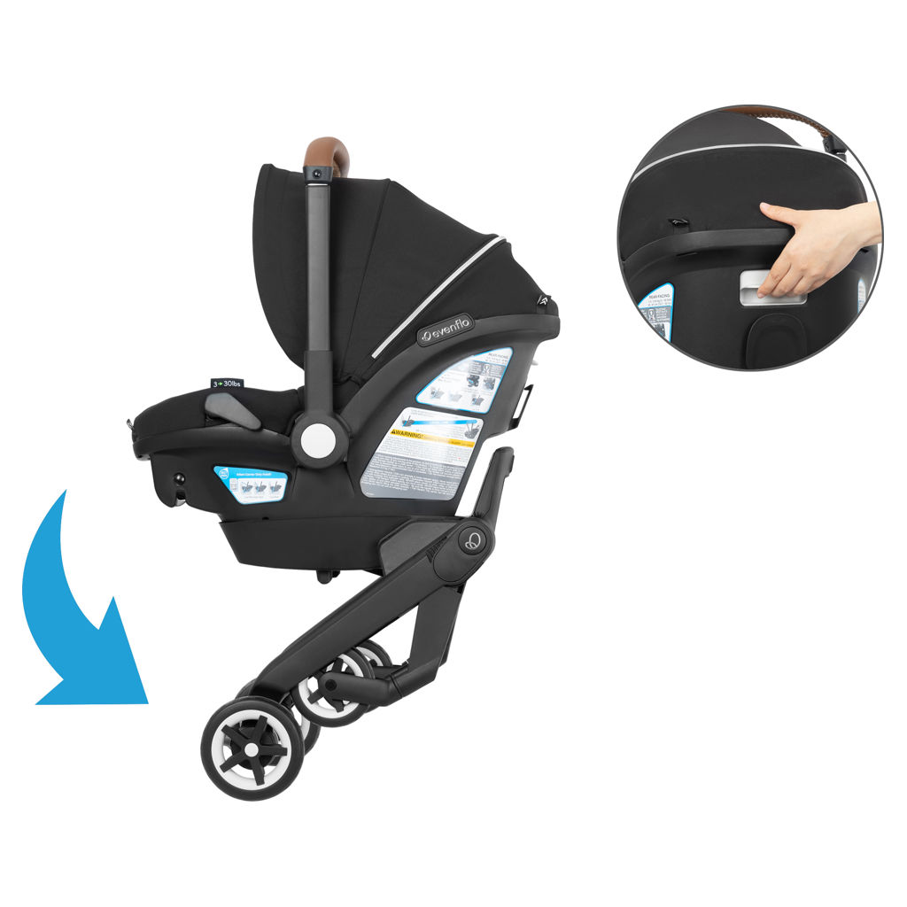 The Evenflo Shyft DualRide Infant Car Seat and Stroller Combo lets you move from car seat to stroller in just one step. Ready to go from the vehicle to a walk? Simply lift the carrier from the base, unlock the wheels, and you're off in seconds. Heading up or down stairs? Tuck in the wheels, carry your baby safely, then pop the wheels back out and roll on.