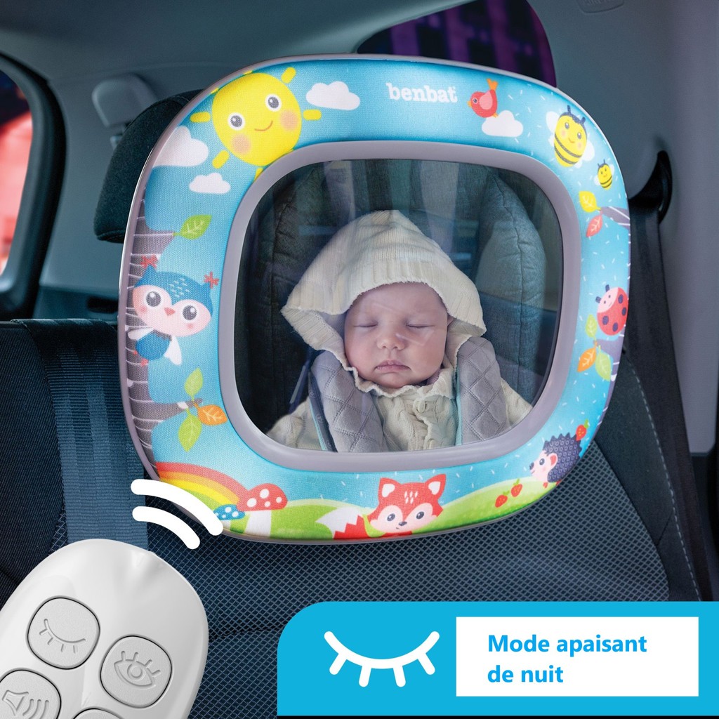 Find your little helper for a safe drive with our Night & Day baby view mirror with magical unicorn patterns to keep your baby soothed & entertained. Baby is tired? Activate the soothing mode and your little one will fall asleep to soothing lullabies and slow twinkling lights in tune with the music around the mirror.