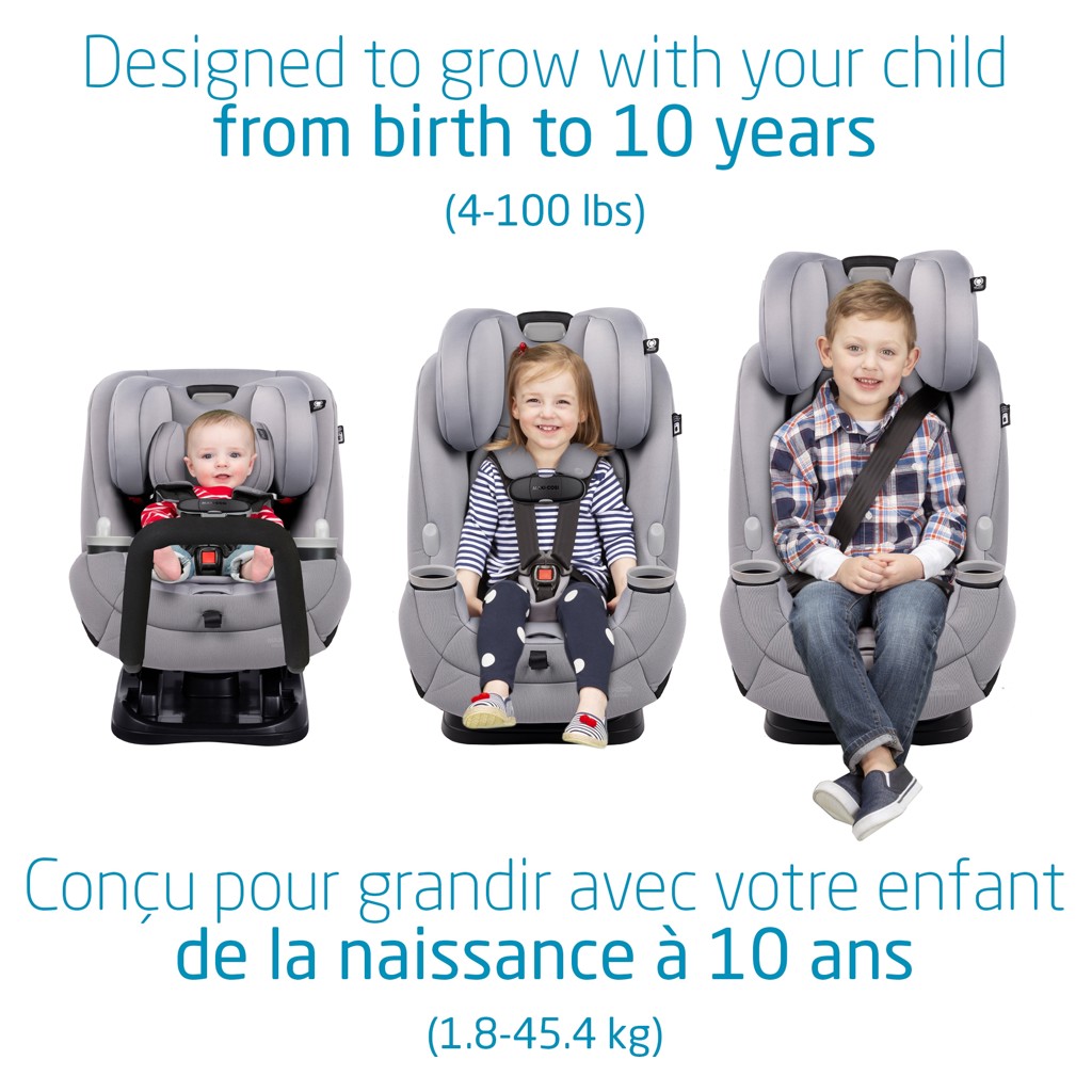 Children can travel rear-facing, from 1.8 to 18.1 kg (4-40 lb); forward-facing up to 29.4 kg (65 lb); and up to 45.3 kg (100 lb) in booster seat mode. This may be the only car seat you'll ever need.