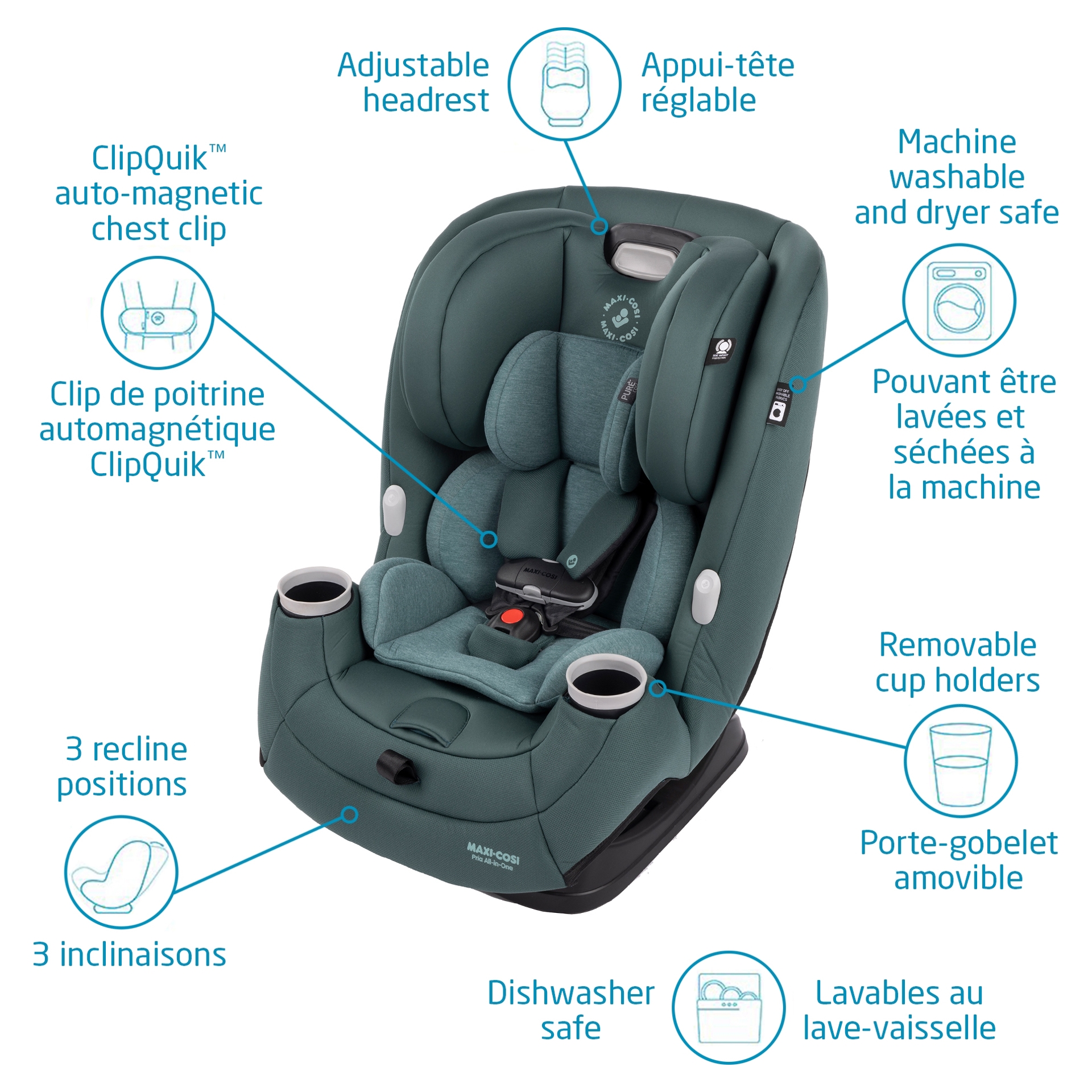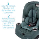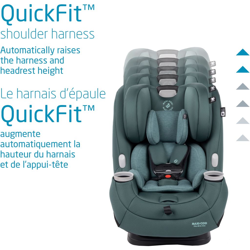 Conversion of the Pria All-In-One convertible car seat at each new stage is simple and intuitive, allowing you to adjust the car seat quickly. It offers a wide range of adaptability with its 3-position recline, 5 headrest heights and QuickFit shoulder harness.