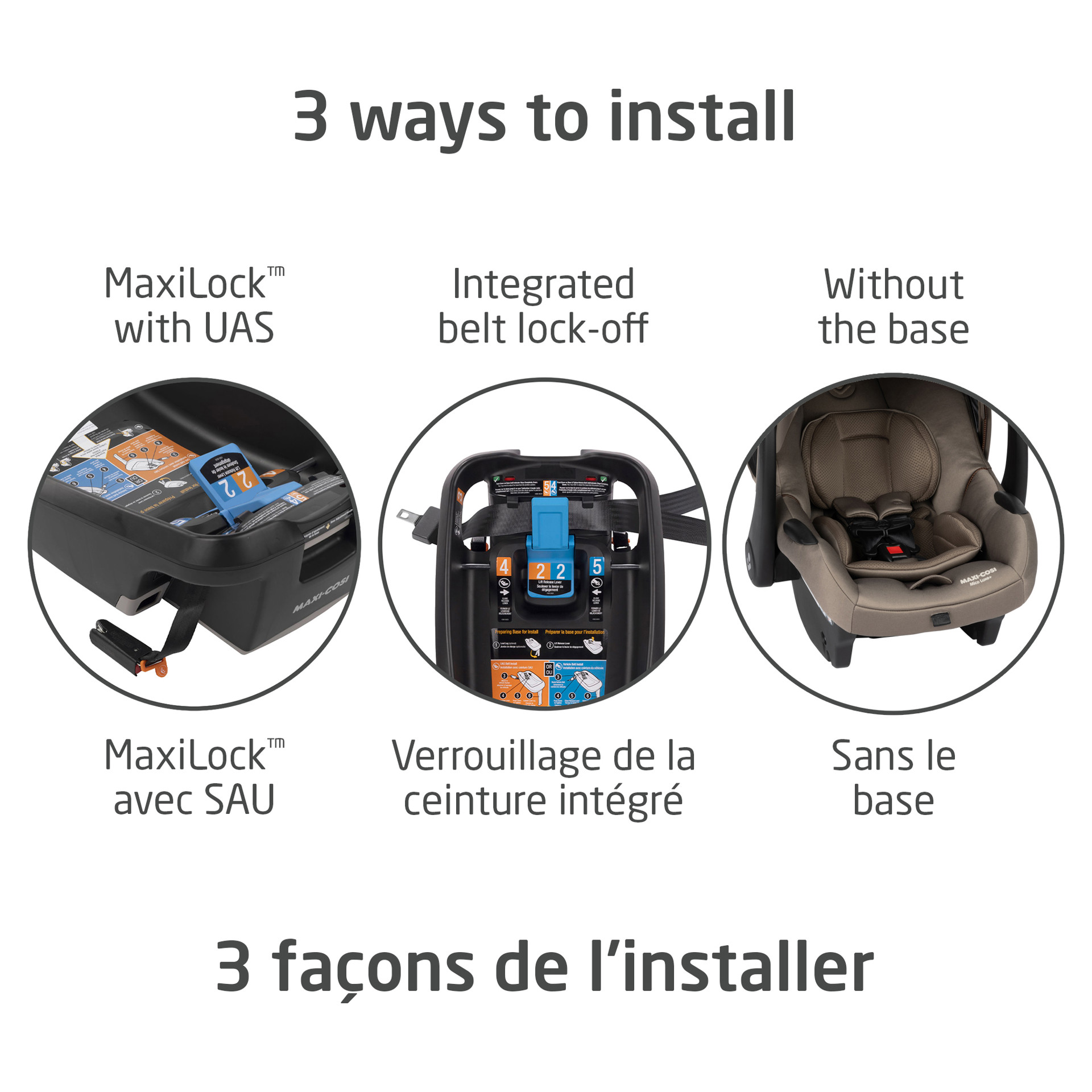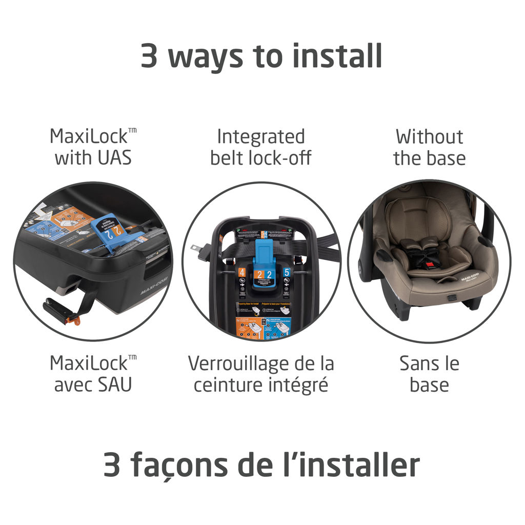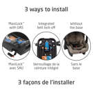 The intuitive base installation features MaxiLock™  technology with red-to-green tightness indicators, a 3-position adjustable base, a self-tightening UAS system, and a load leg which adds stability and limits movement in the event of a collision. Taxi-mode is simple and convenient with large, visible belt guides that show how to position the belt without using the base.