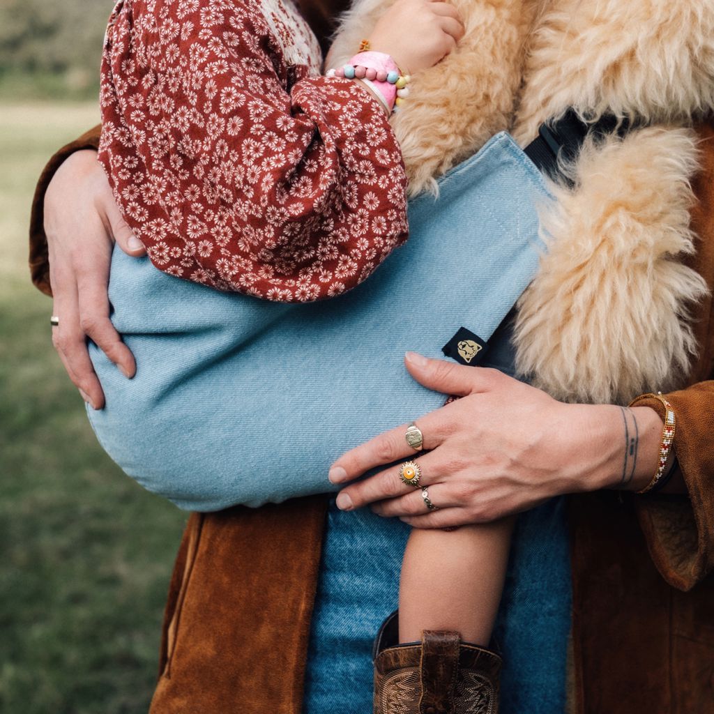 Crafted from 100% cotton denim fabric, this side-carry baby carrier combines comfort and durability for endless adventures with your little one. Just like the strength of denim, face every journey with resilience and confidence.