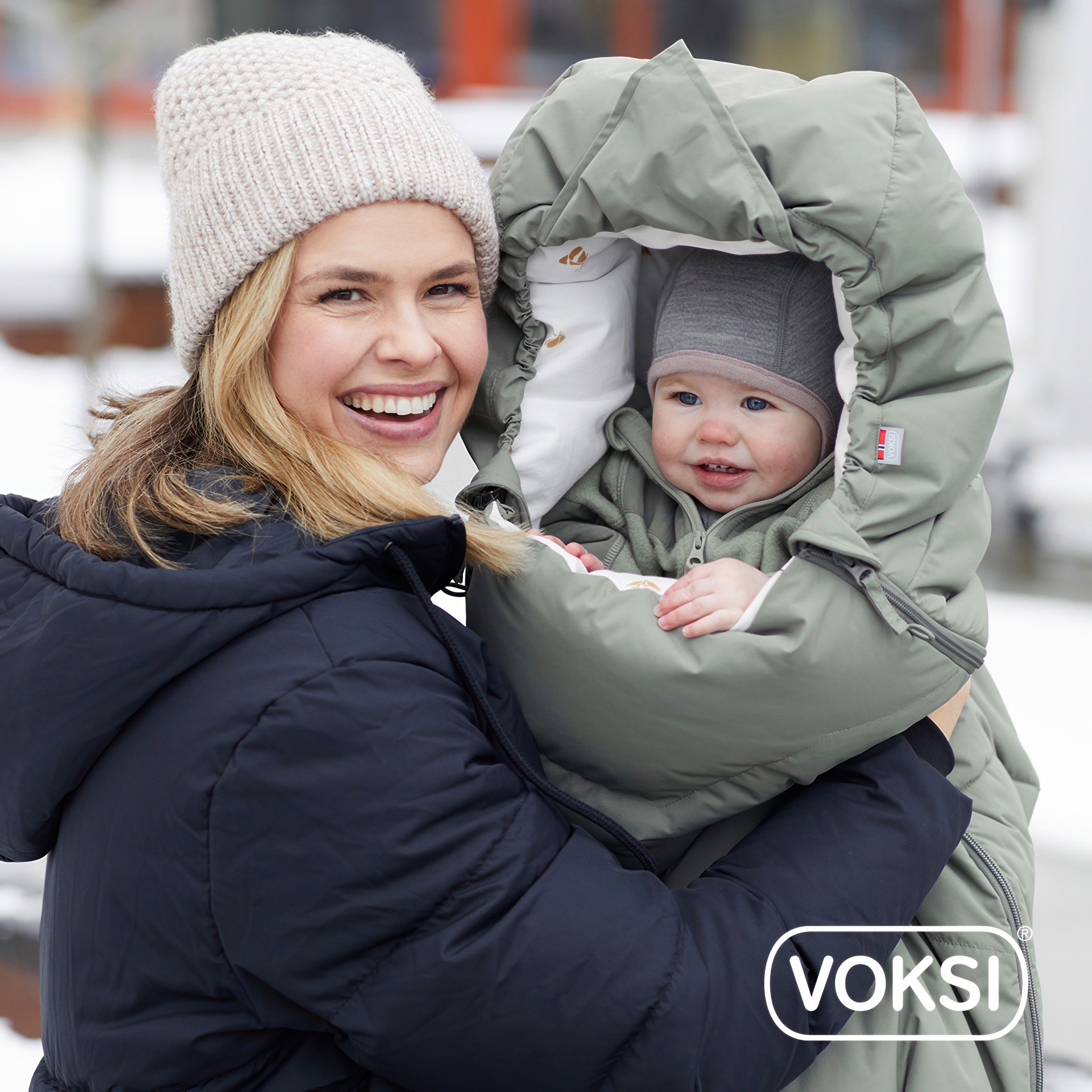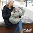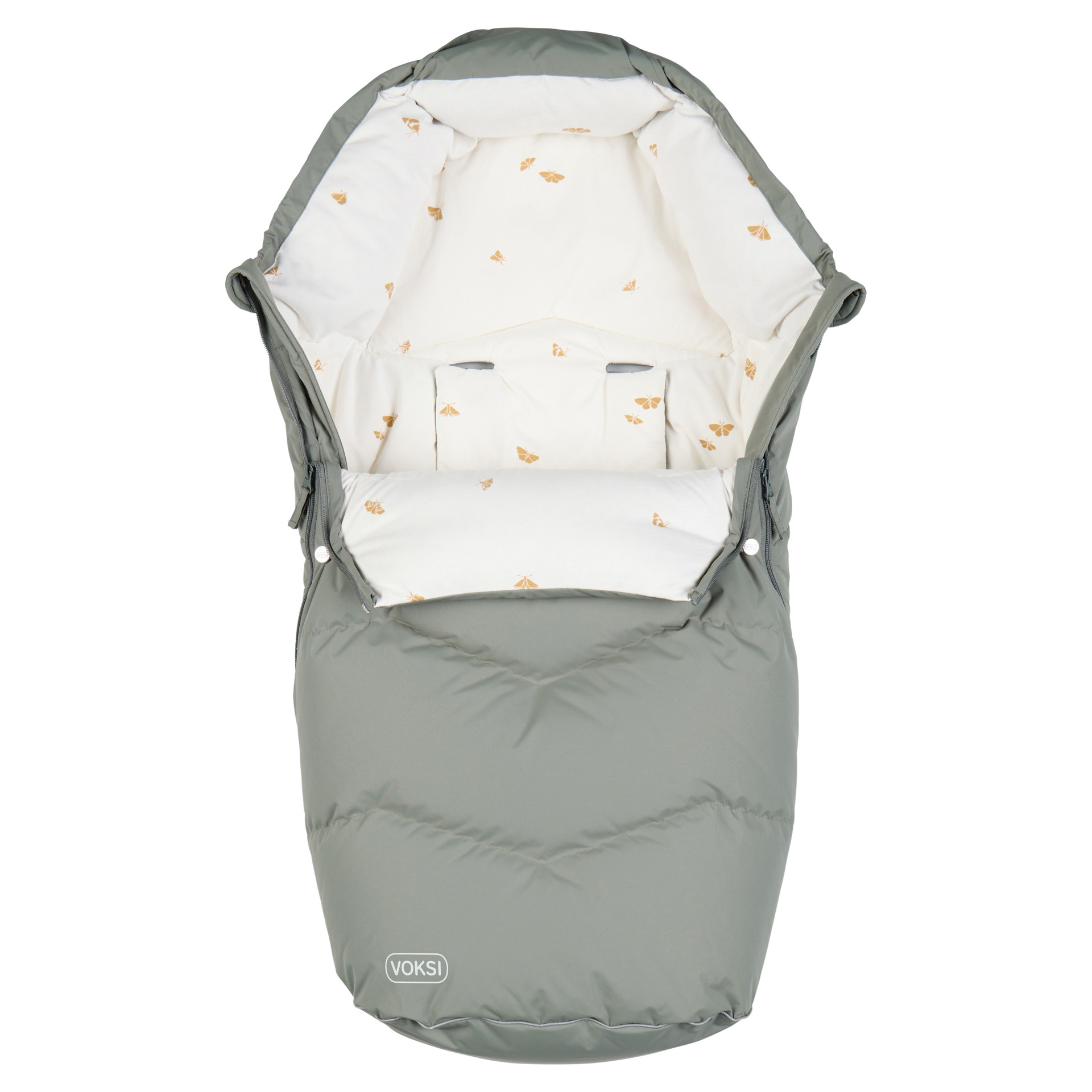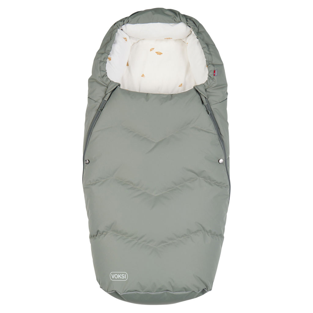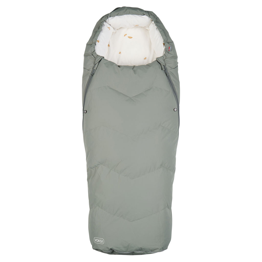 The Voksi Urban stroller sleeping bag opens with a zipper featuring an internal wind flap and two sliders. The zipper goes all the way around, allowing the front part to be opened from both sides and fully unzipped.