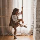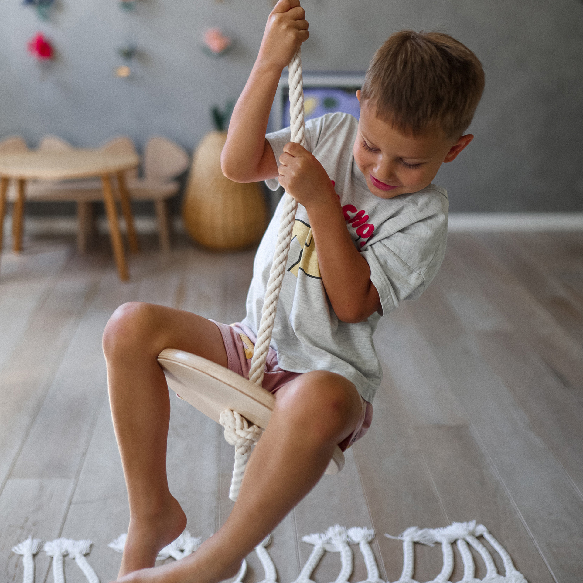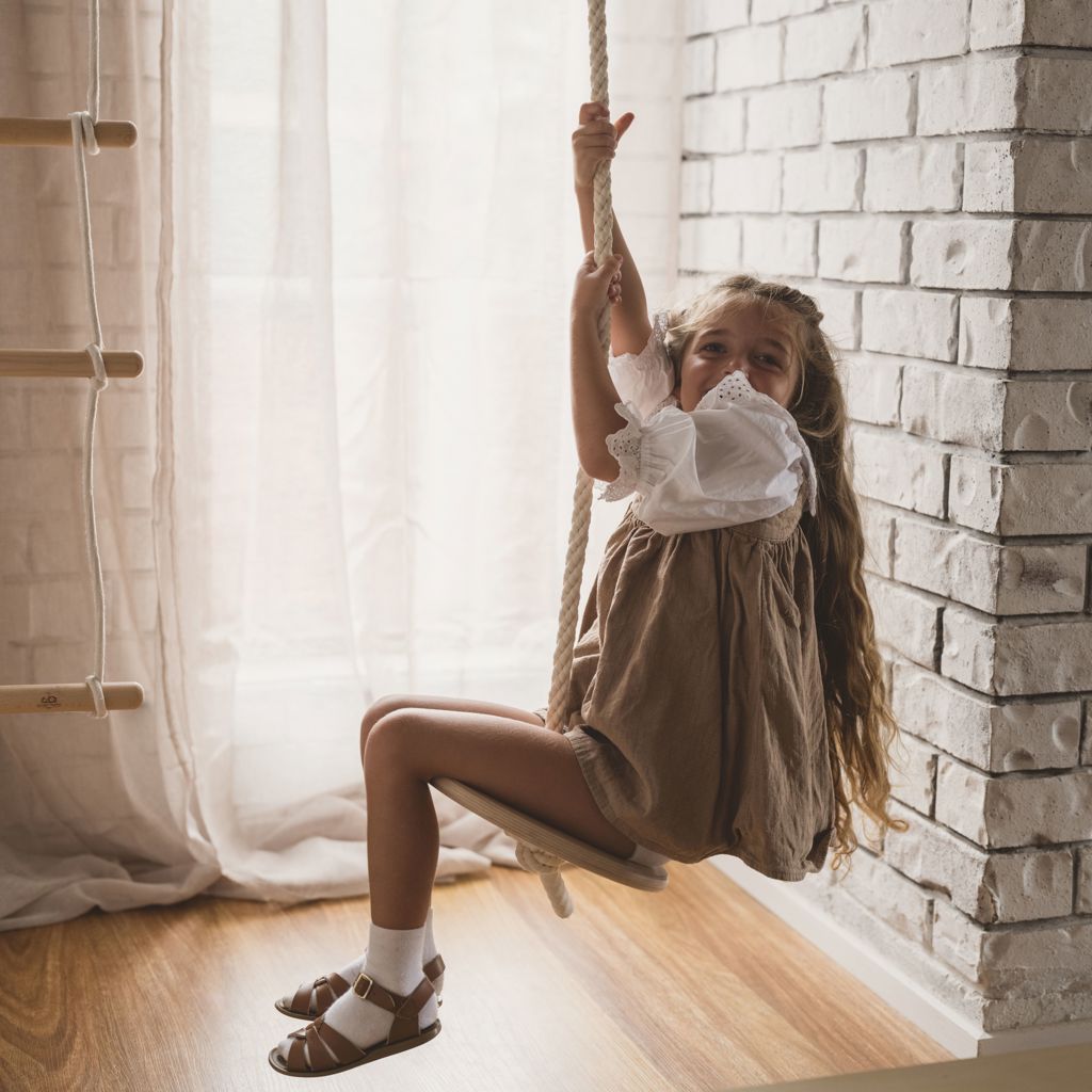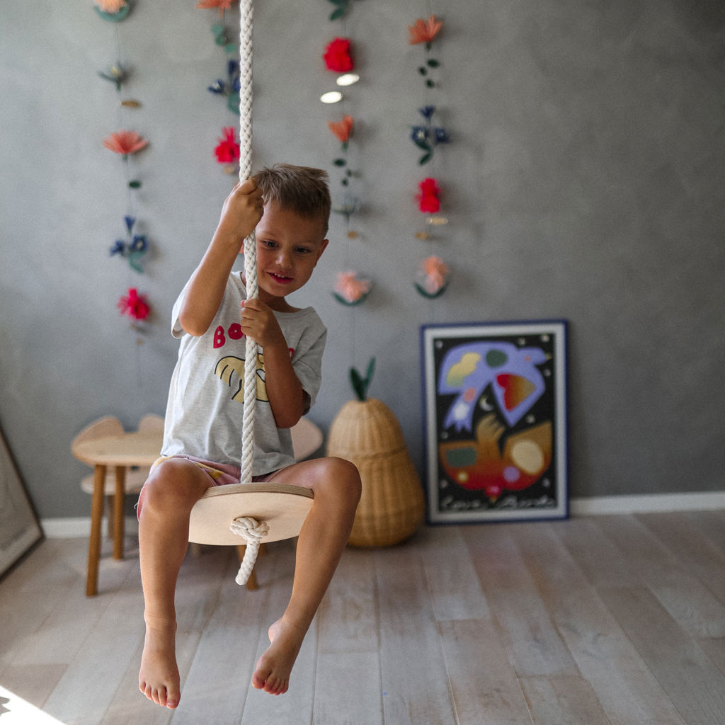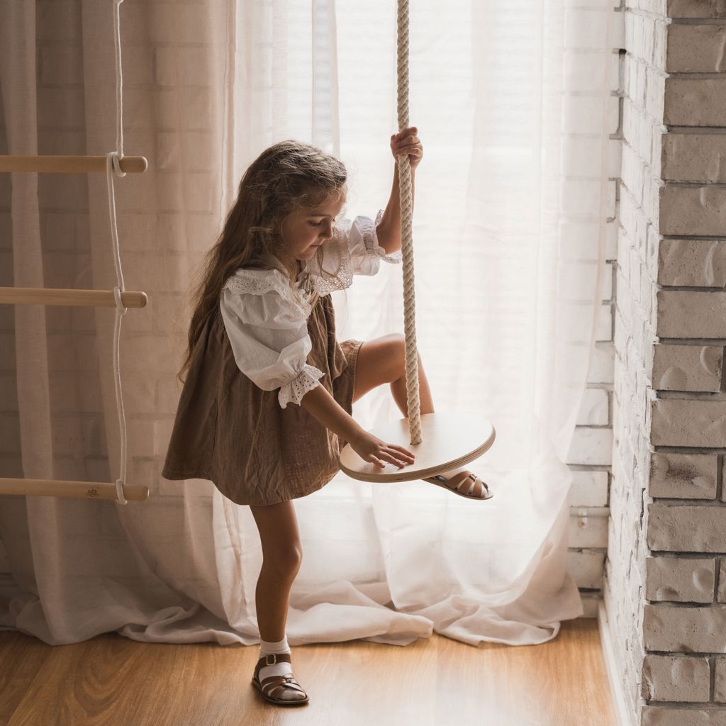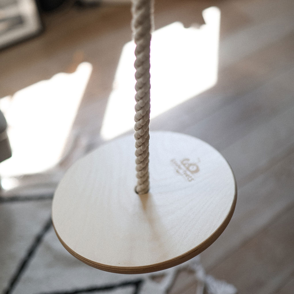 During play, a child develops core strength, balance and coordination, spatial awareness, and self-esteem. Handmade from birchwood and rope; and finished with nontoxic water-based lacquer. The Swinging Disc pairs wonderfully alongside the Kinderfeets Child's Swing, Trapeze with Rings, and Climbing Ladder.
