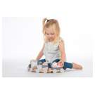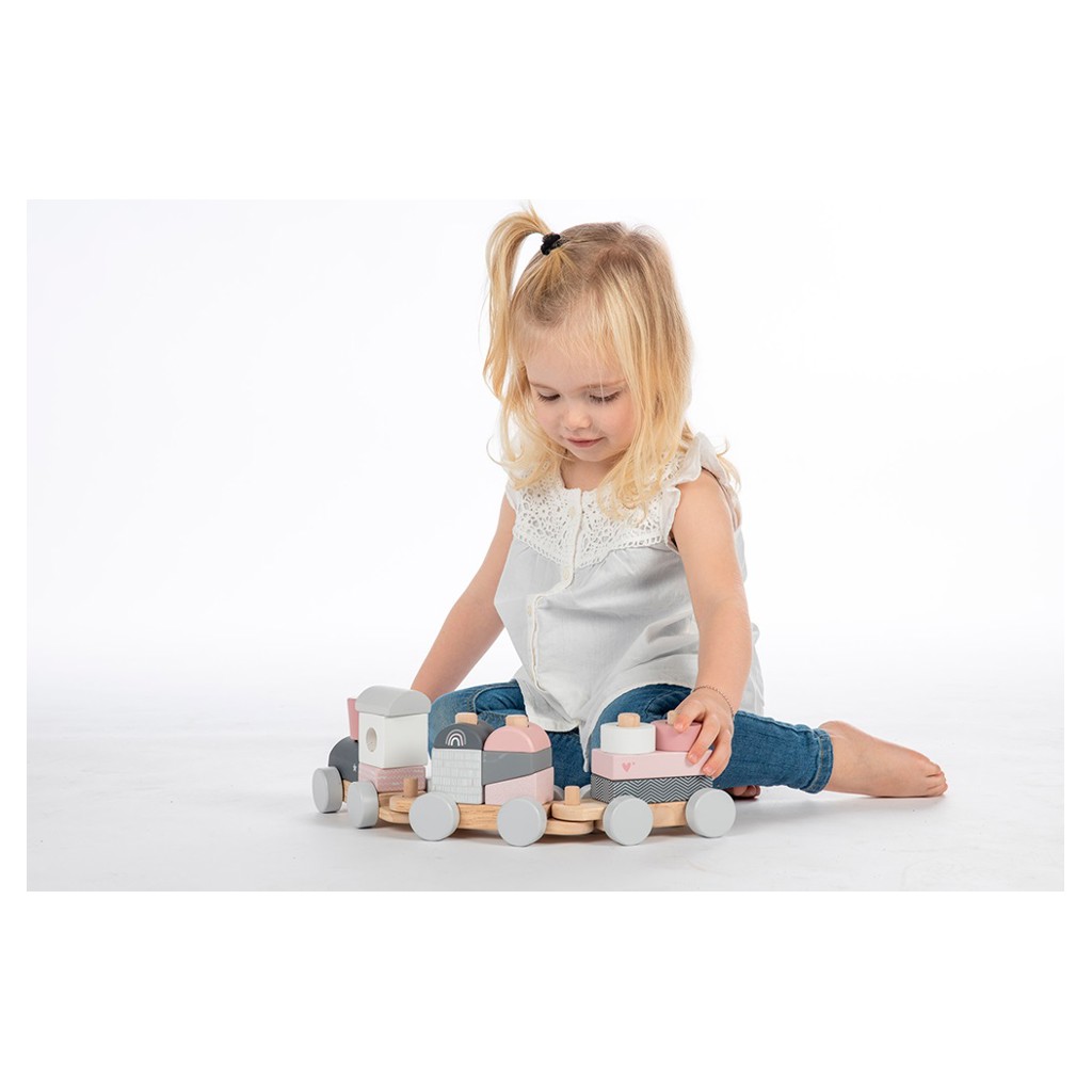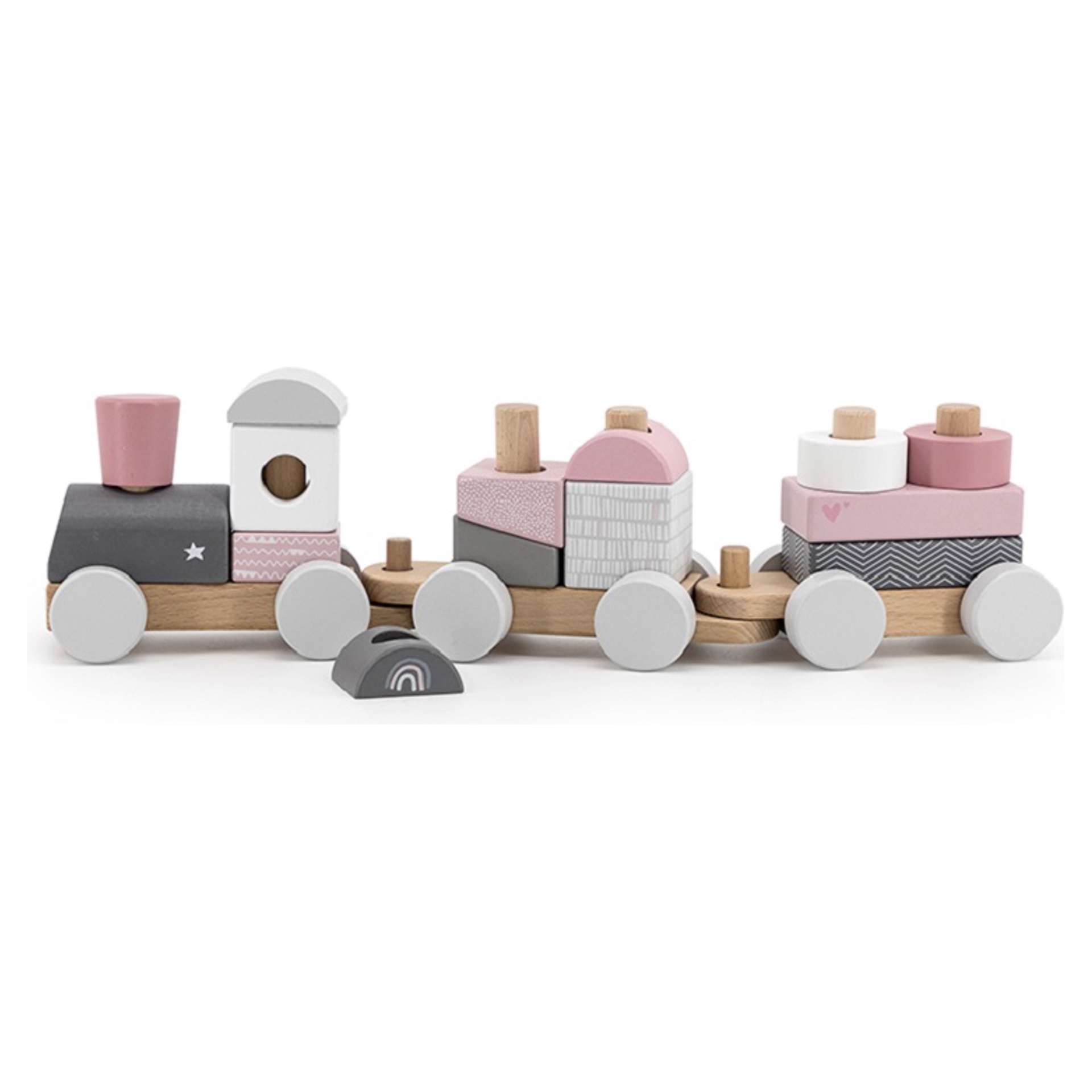 The Label Label stacking train is made of high-quality FSC certified beech wood and was painted in beautiful soft pink, white and gray tones using child-friendly water based paint. The wooden blocks, with different colours, symbols and patterns can be used without the wagons for stacking, building...