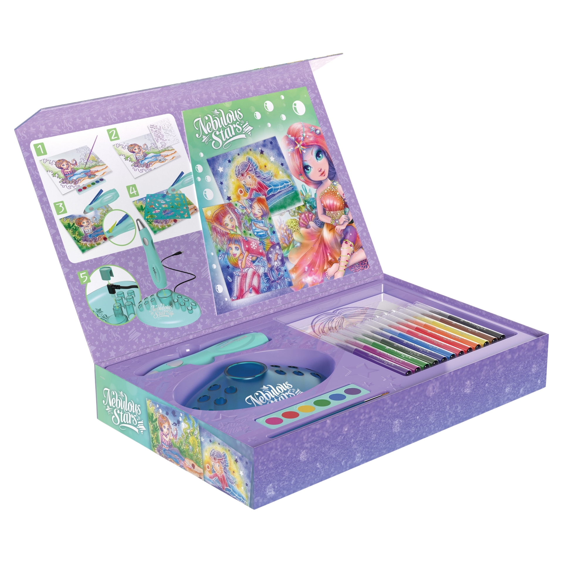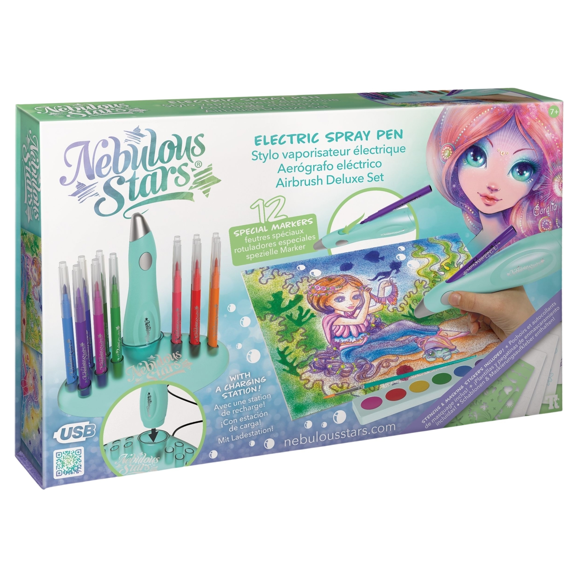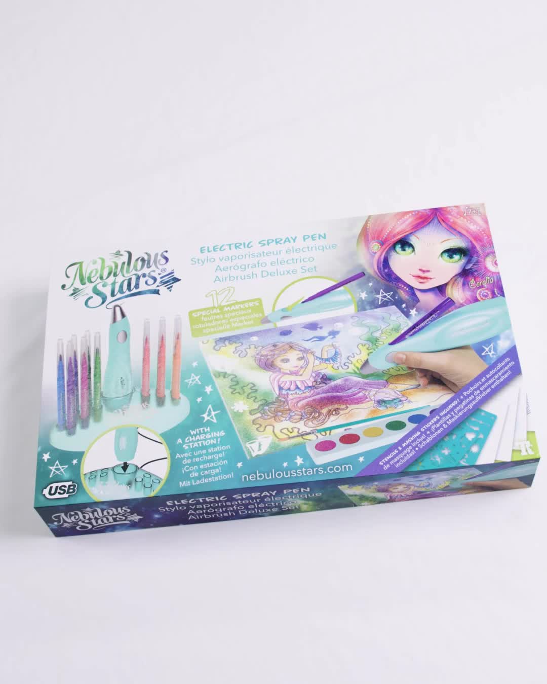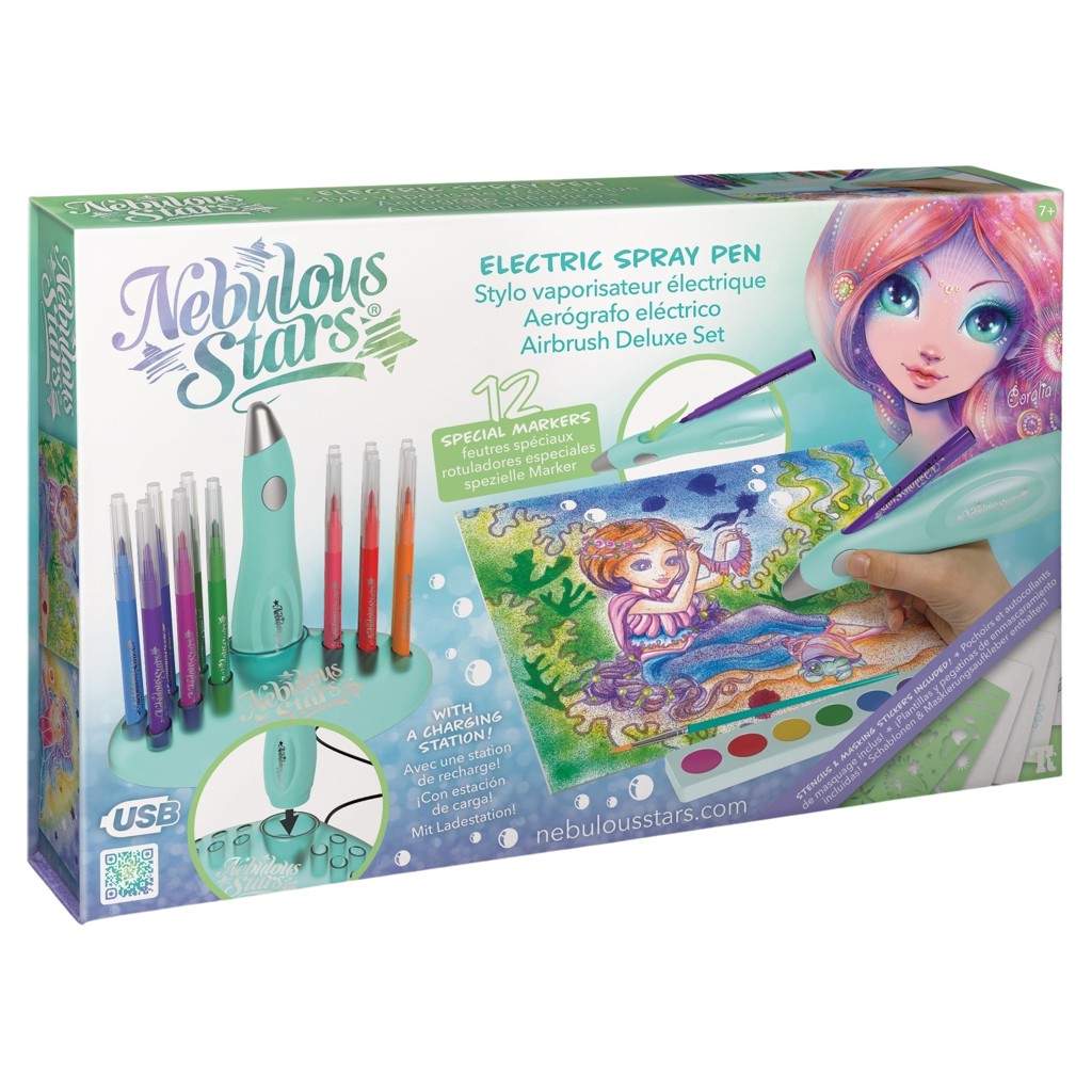 Airbrush like the pros! Select the water-based paint of your choice, insert the felt-tip pen into the refillable electric pen, then gently spray the paint onto the pictures. Also includes stencils, watercolor paint and mask stickers.
