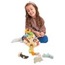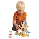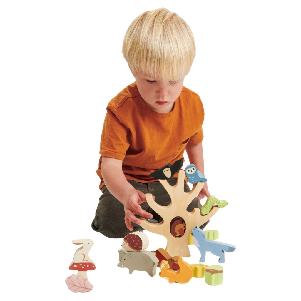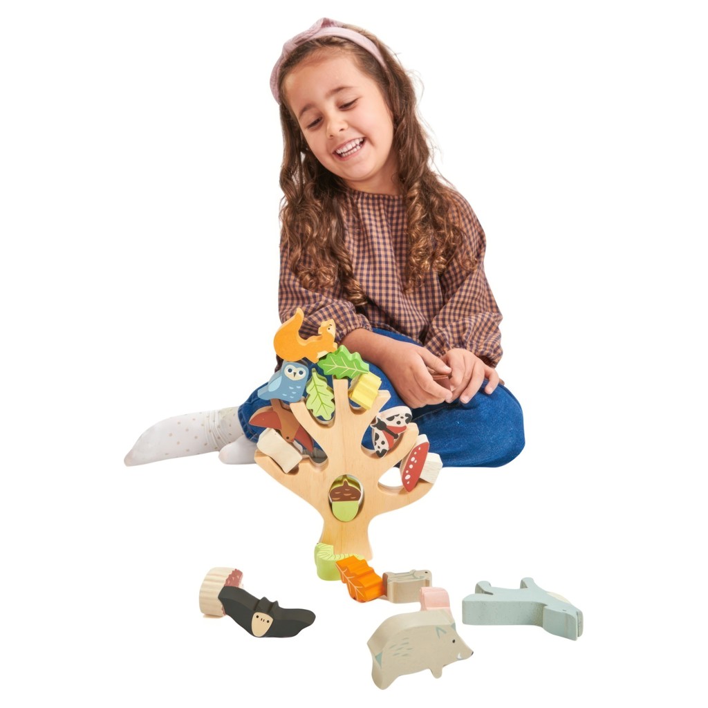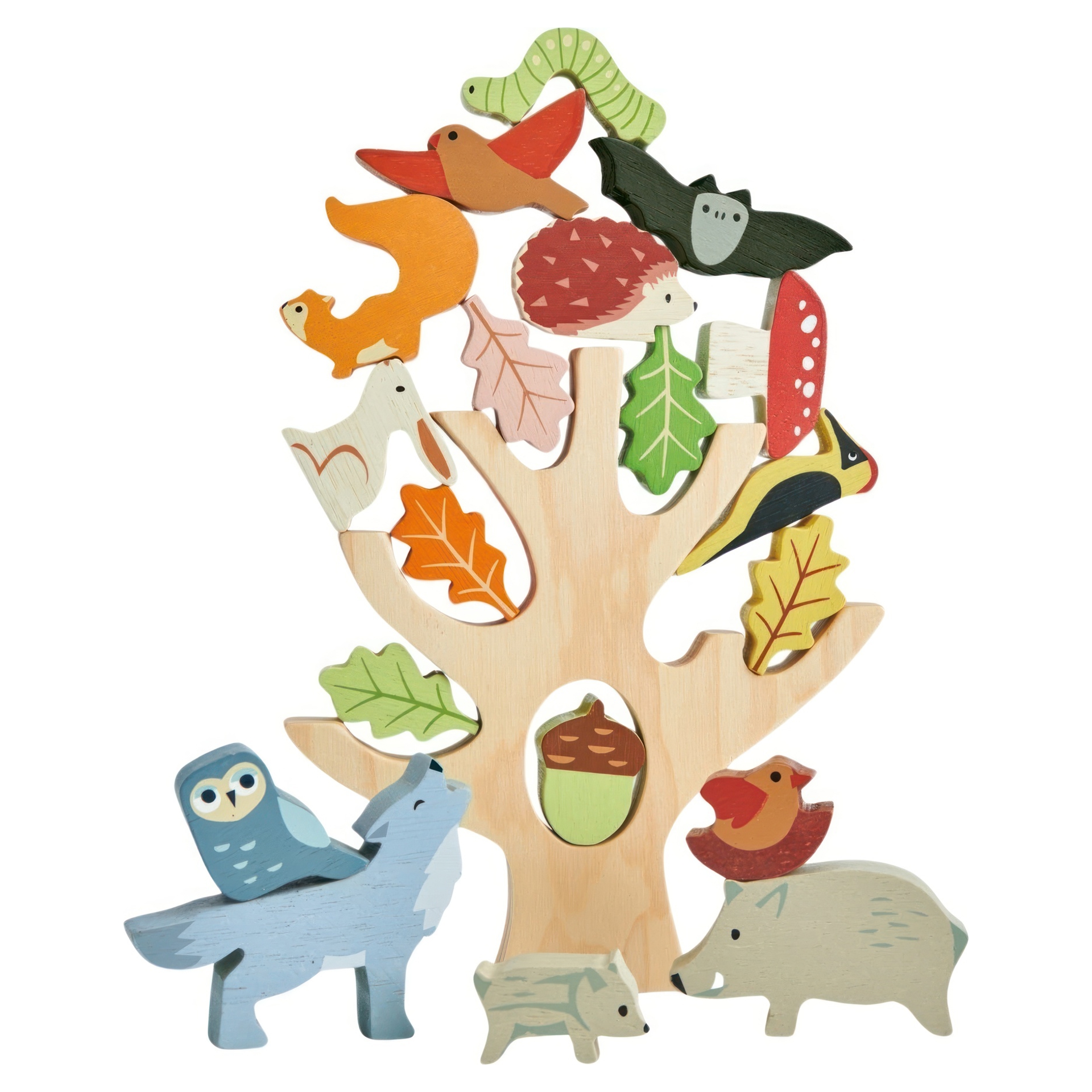 A wooden stacking tree trunk with 19 stylishly colored animals and plants including an owl, a bat, a wolf, a squirrel, a woodpecker, an acorn, a mummy pig with her baby, a caterpillar, five leaves, a toadstool, a rabbit, a hedgehog, a bird, and a bird in a nest.