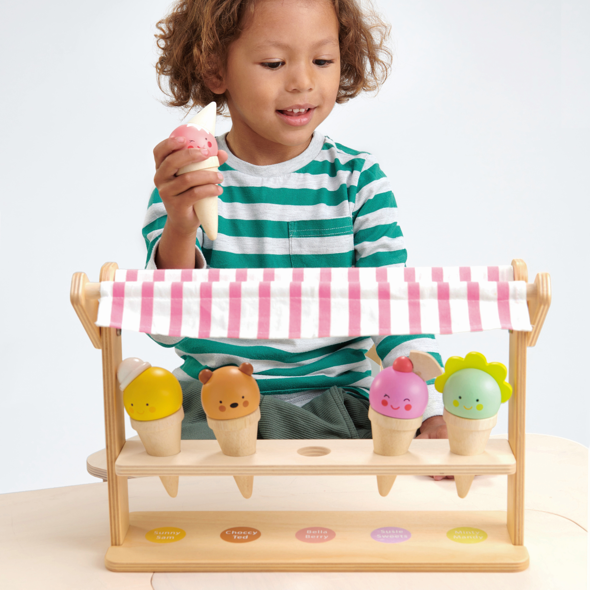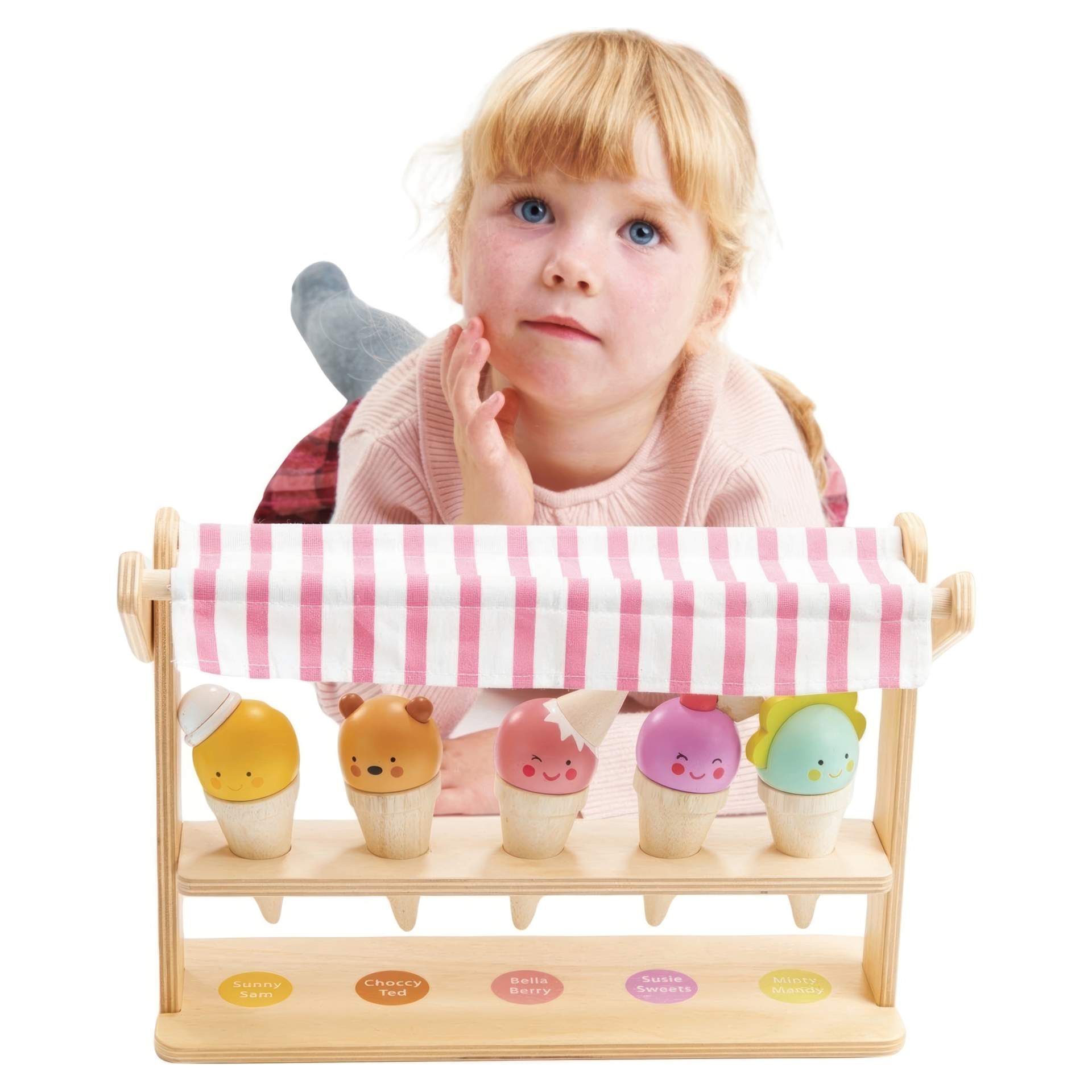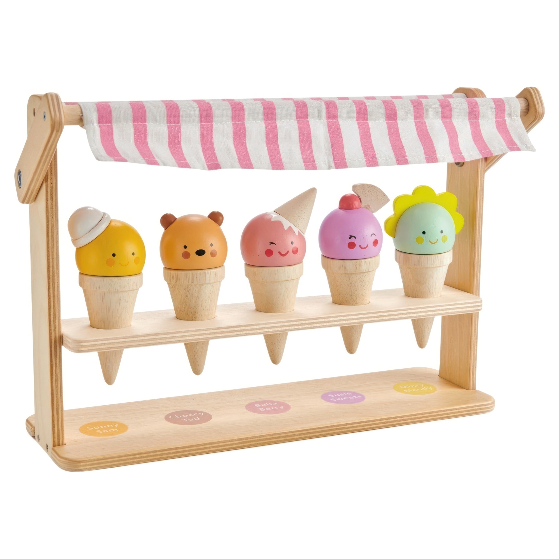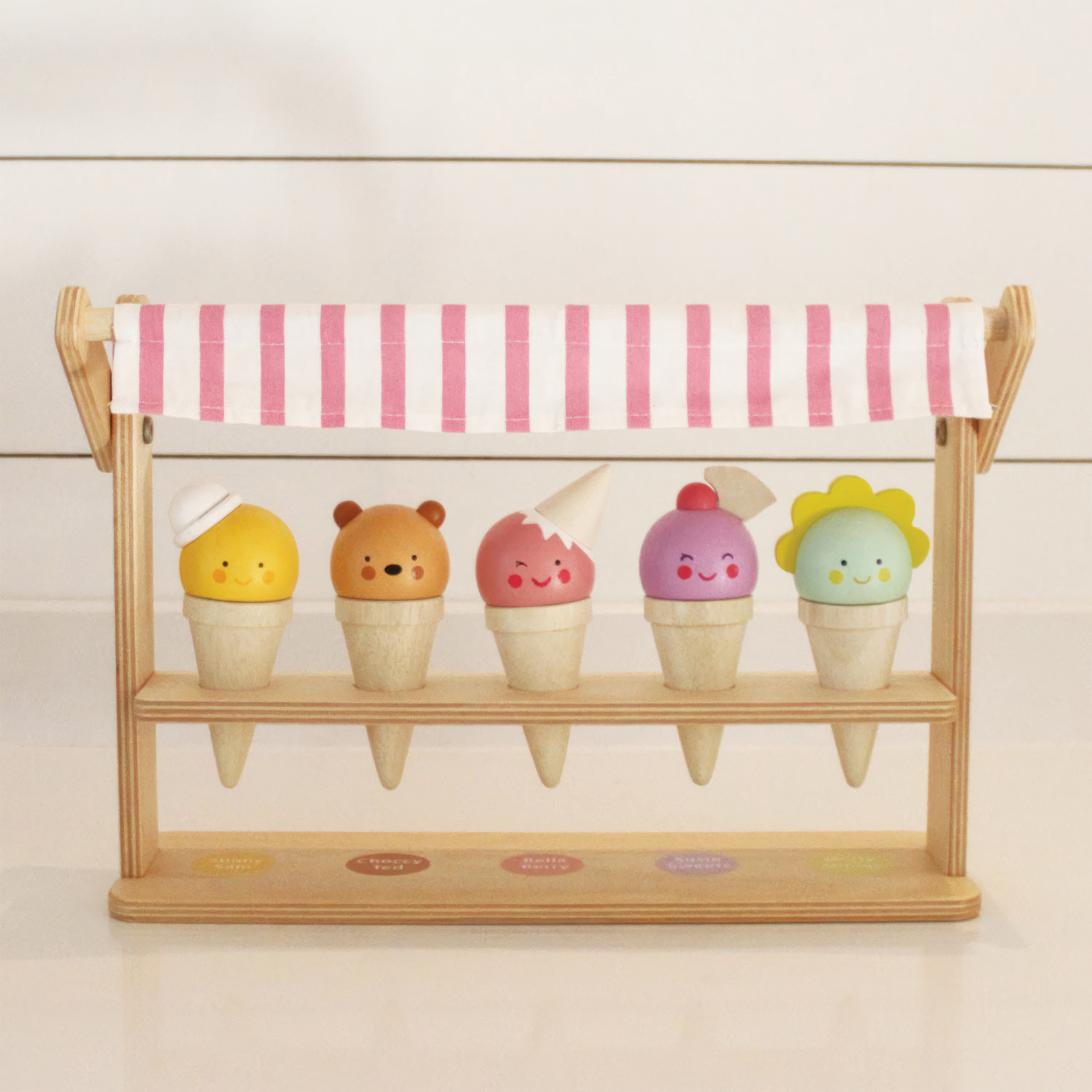 Five deliciously, and very friendly solid wood ice cream cornets adorn this pretty little shop. Choose your flavor and have fun matching the characters to their names.