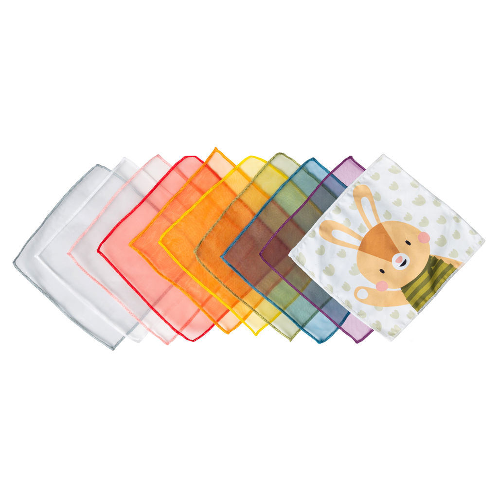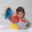 The 9 colorful organza fabrics are soft and delicate to the touch, and are transparent enough to float in the air when tossed and pulled from the silicone toy.
