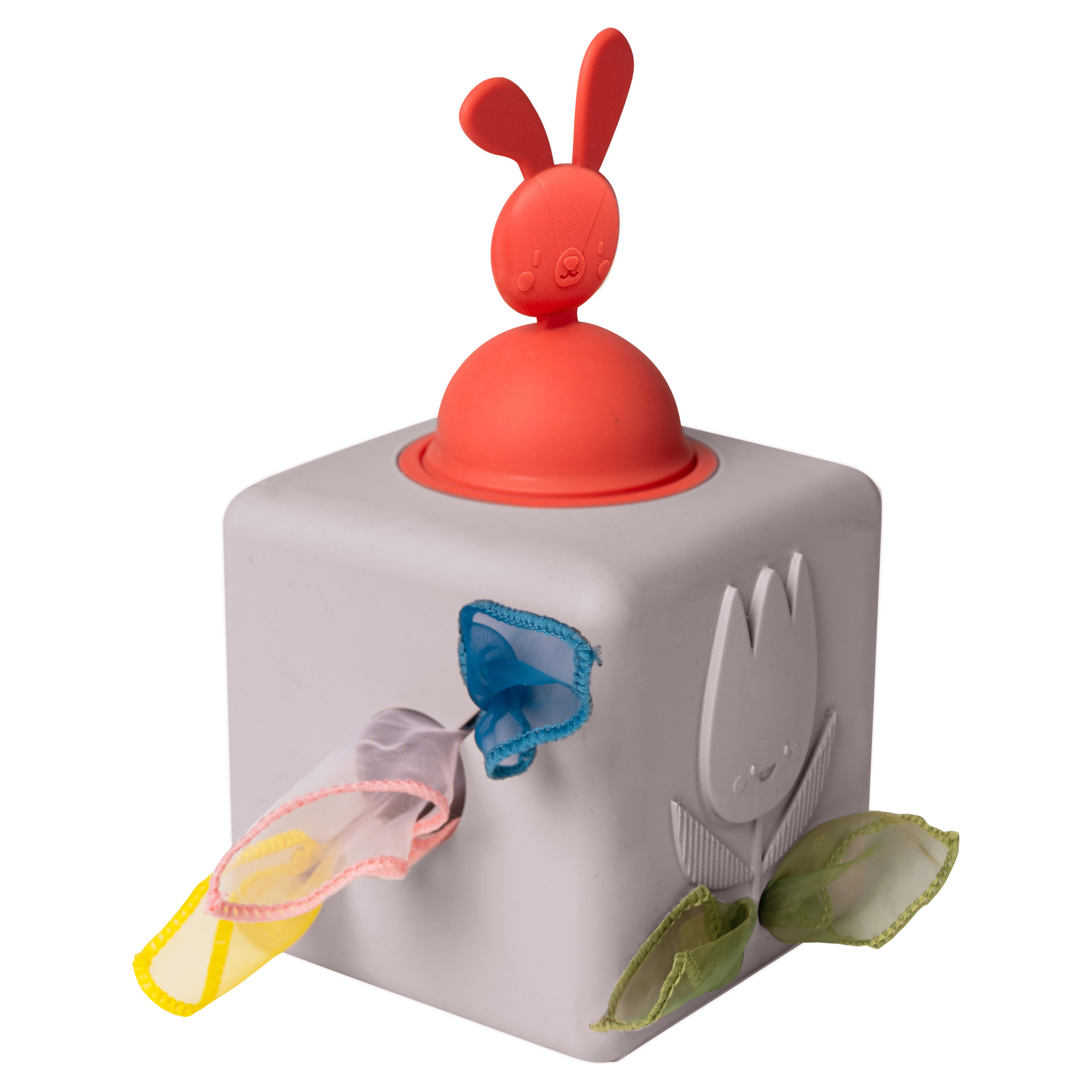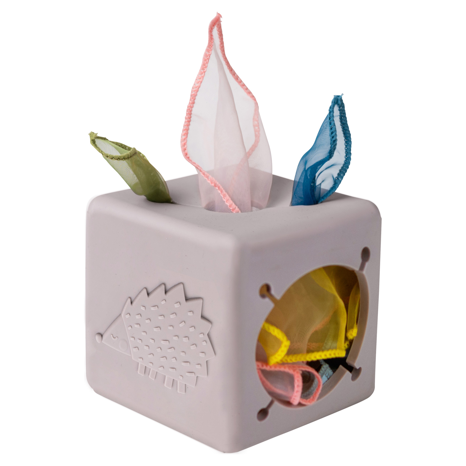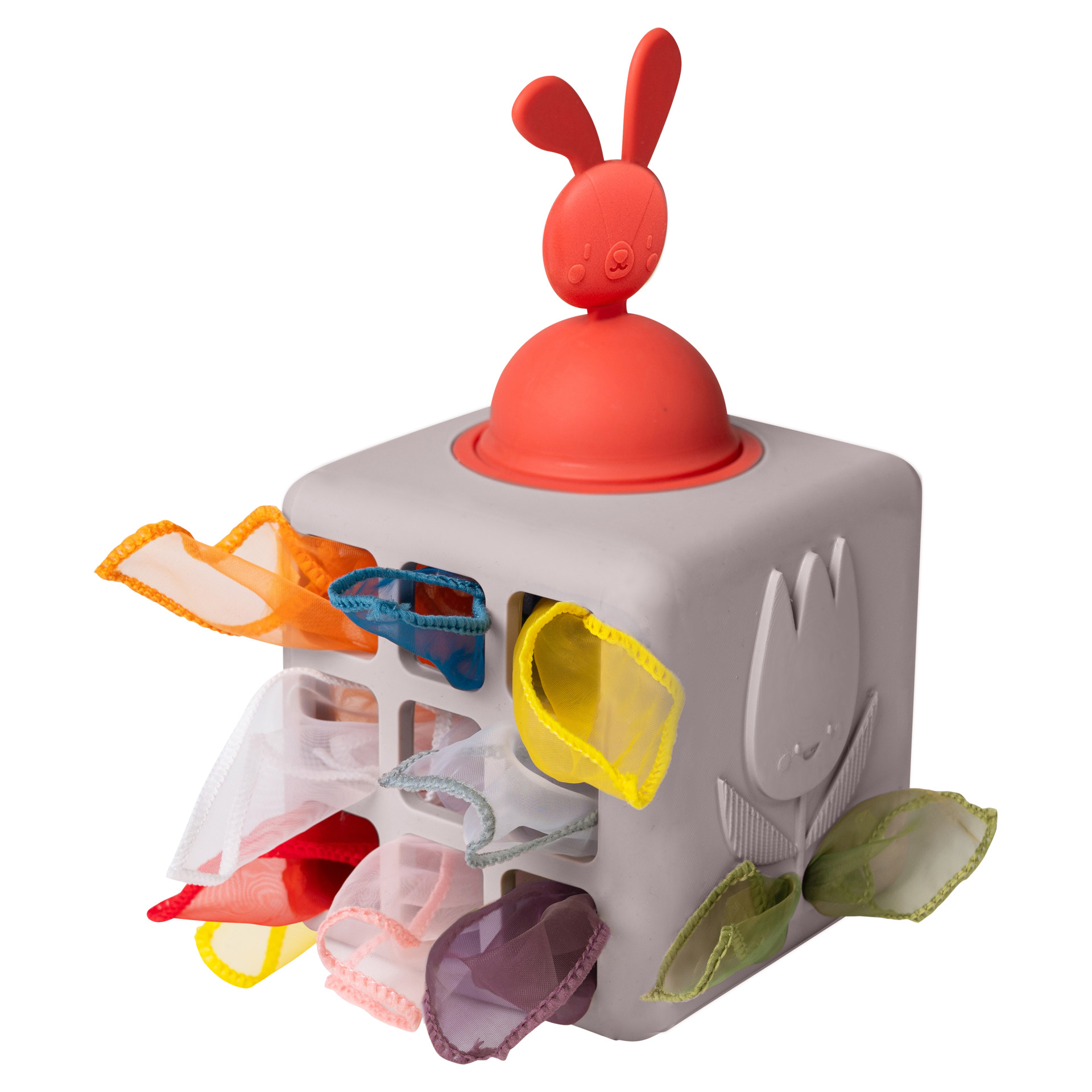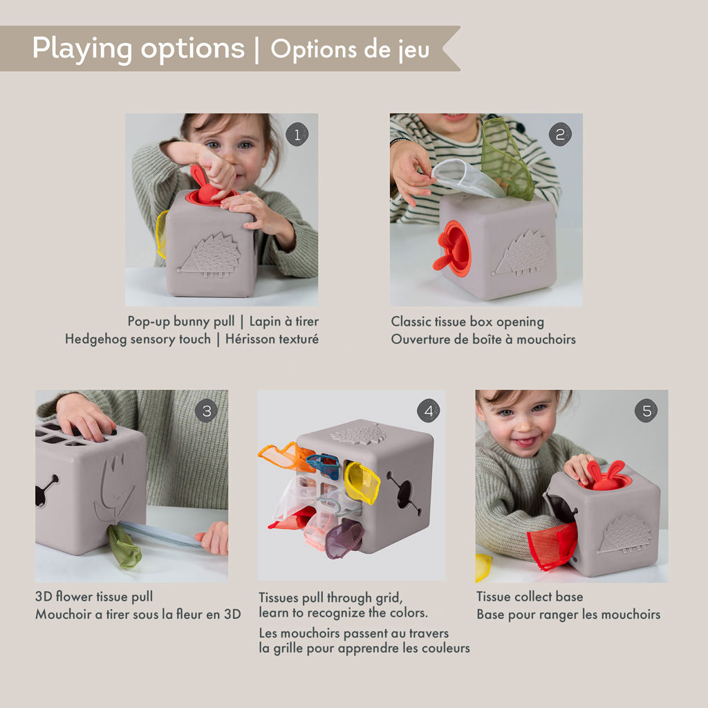 The Pop Up Tissue Box was inspired by toddlers' fascination with wet wipes and tissue boxes. With six sides full of excitement, babies will discover a hidden rabbit head for pull-and-push hide-and-seek, a hedgehog sensory side, and a 3D flower for fun tactile sensations. Plus, there's a special opening designed for little hands to grab tissues!