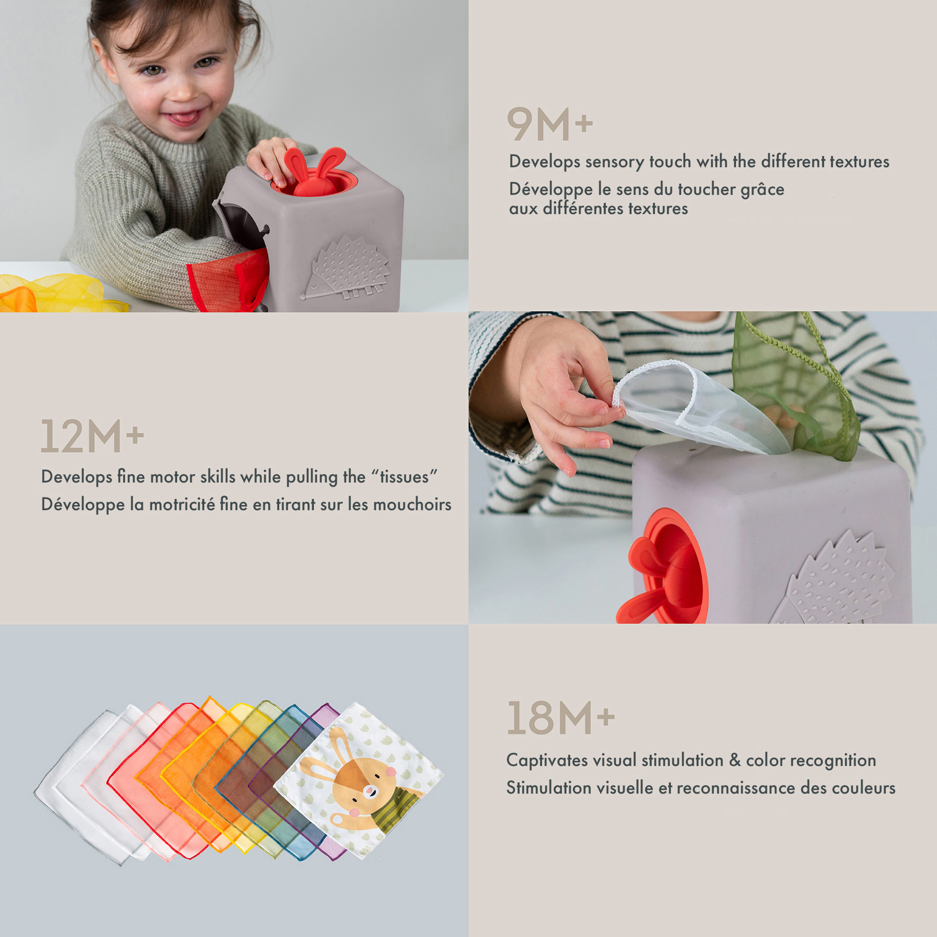 For pure excitement: a rabbit head to pull and push in to play hide-and-seek, a sensory hedgehog side, a large opening hole for handkerchiefs, a 3D flower for fun tactile sensations, a grid side to pull out to develop fine motor and sensory skills.