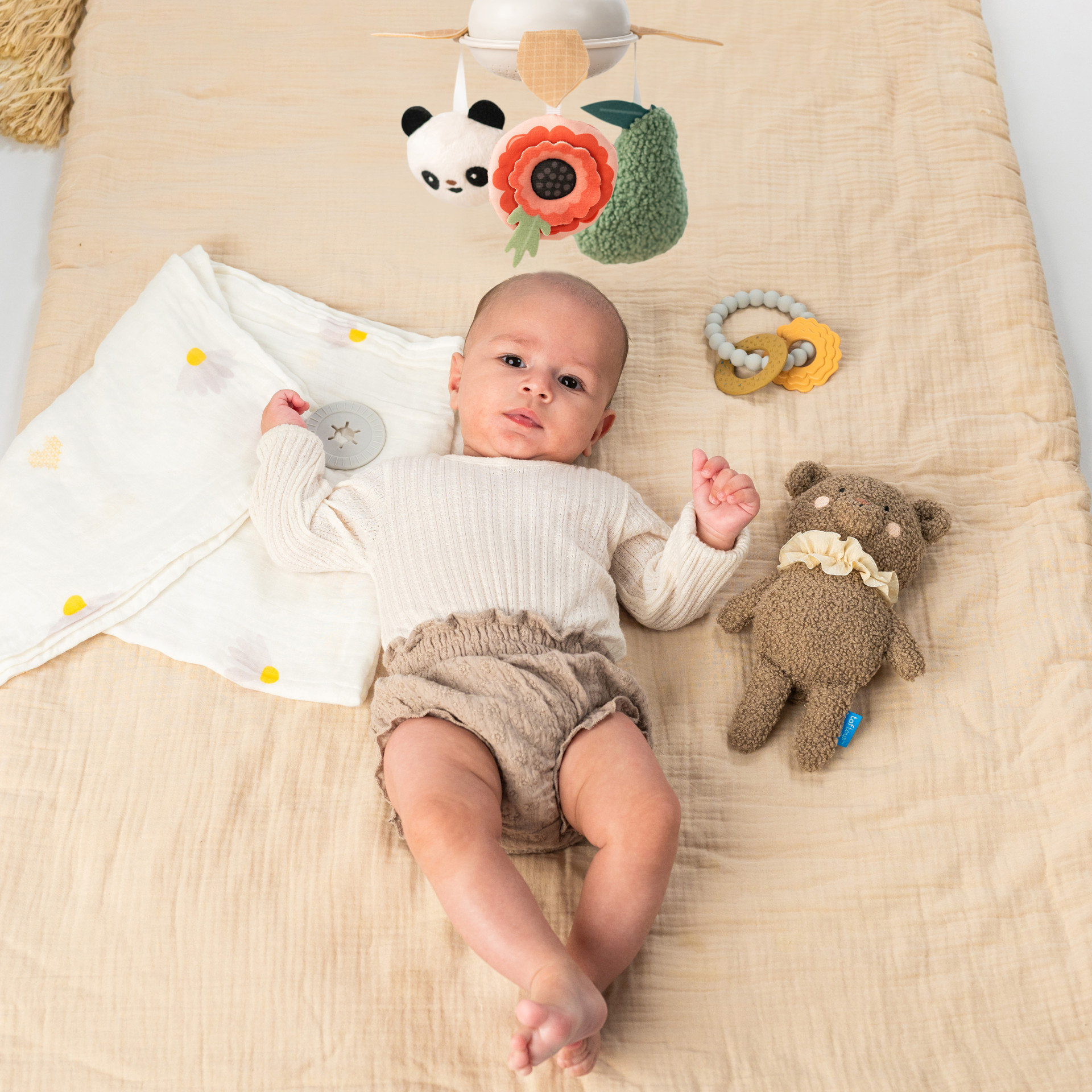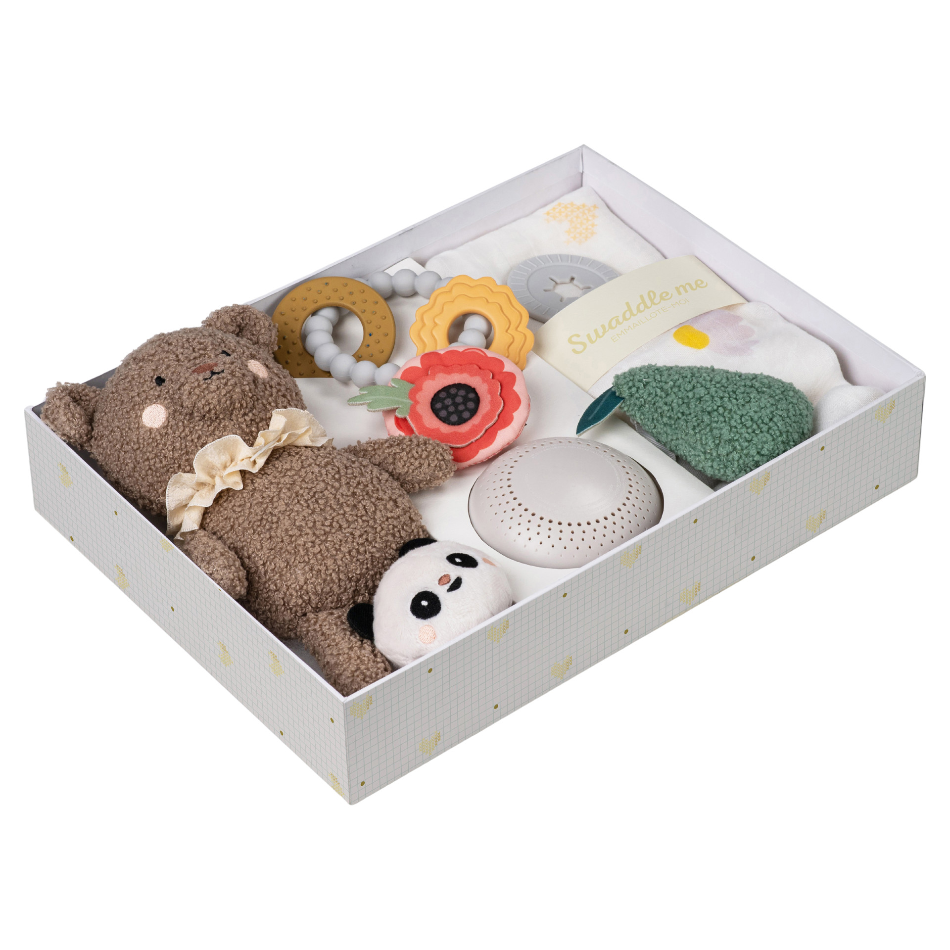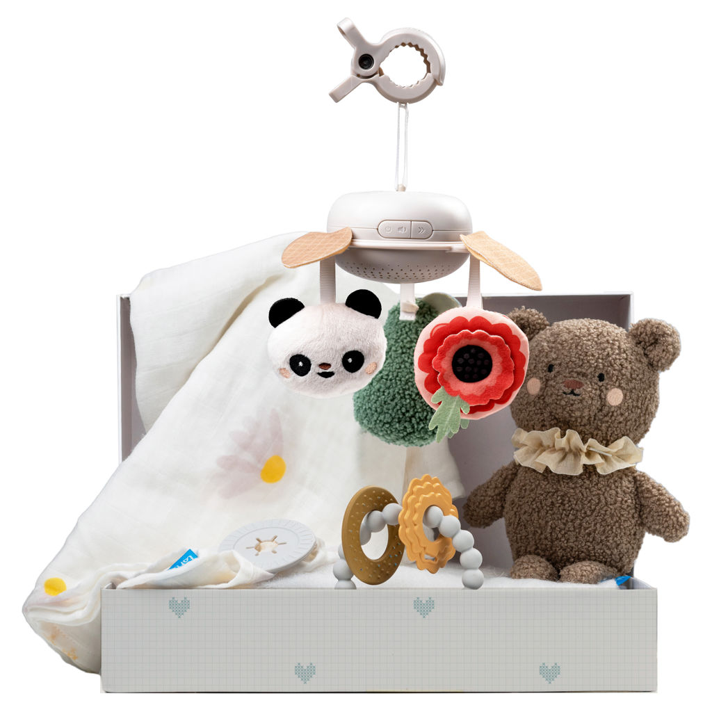 This thoughtfully crafted set includes an extra-large swaddle, a soothing musical mobile, a soft bear plush, and a silicone teether ring.