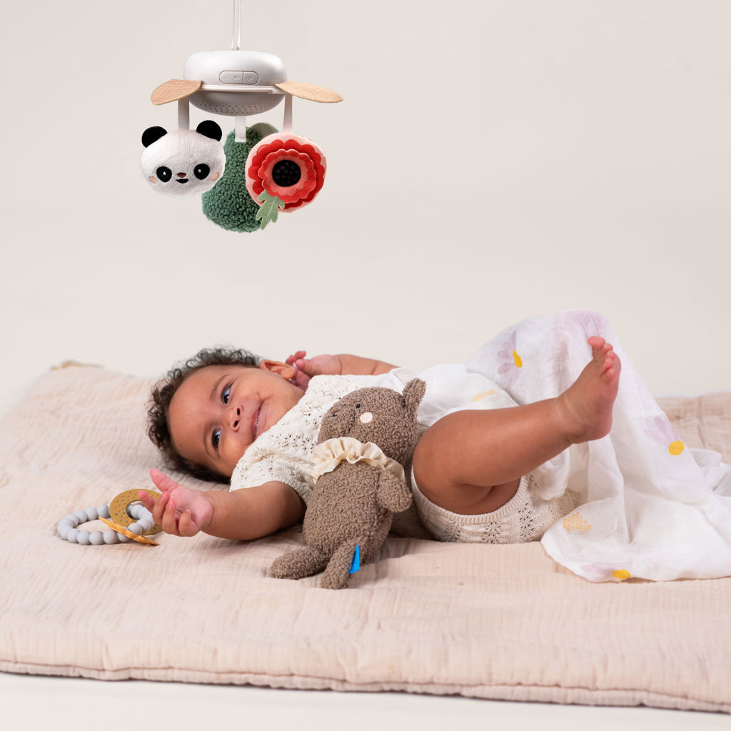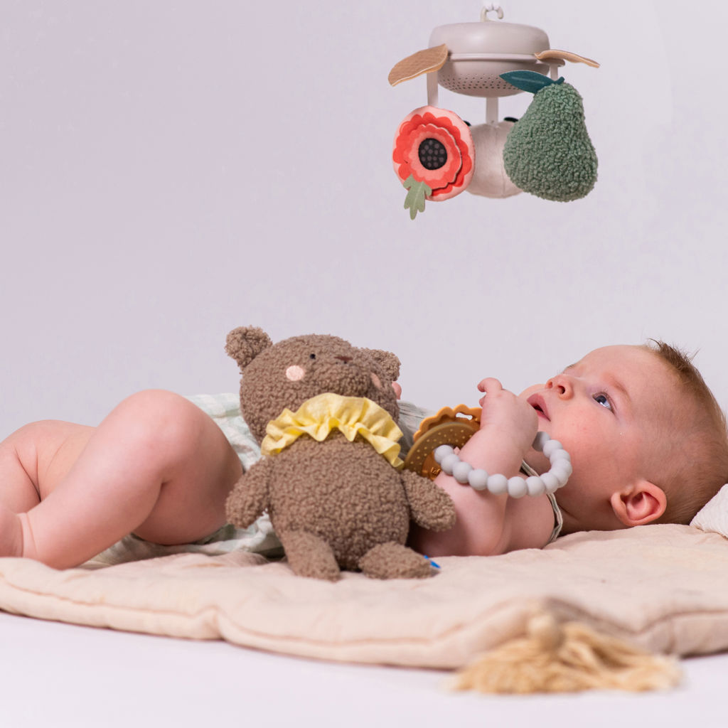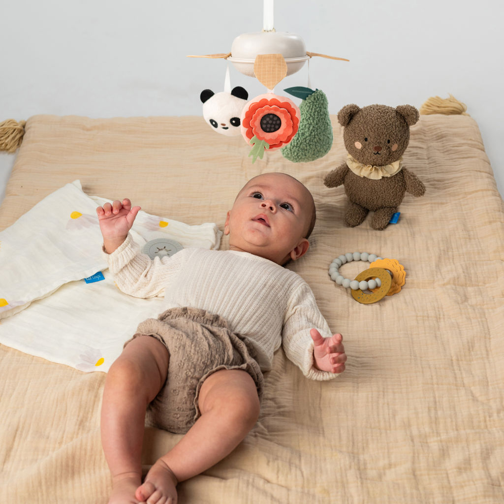 This thoughtfully crafted set includes an extra-large swaddle, a soothing musical mobile, a soft bear plush, and a silicone teether ring.
