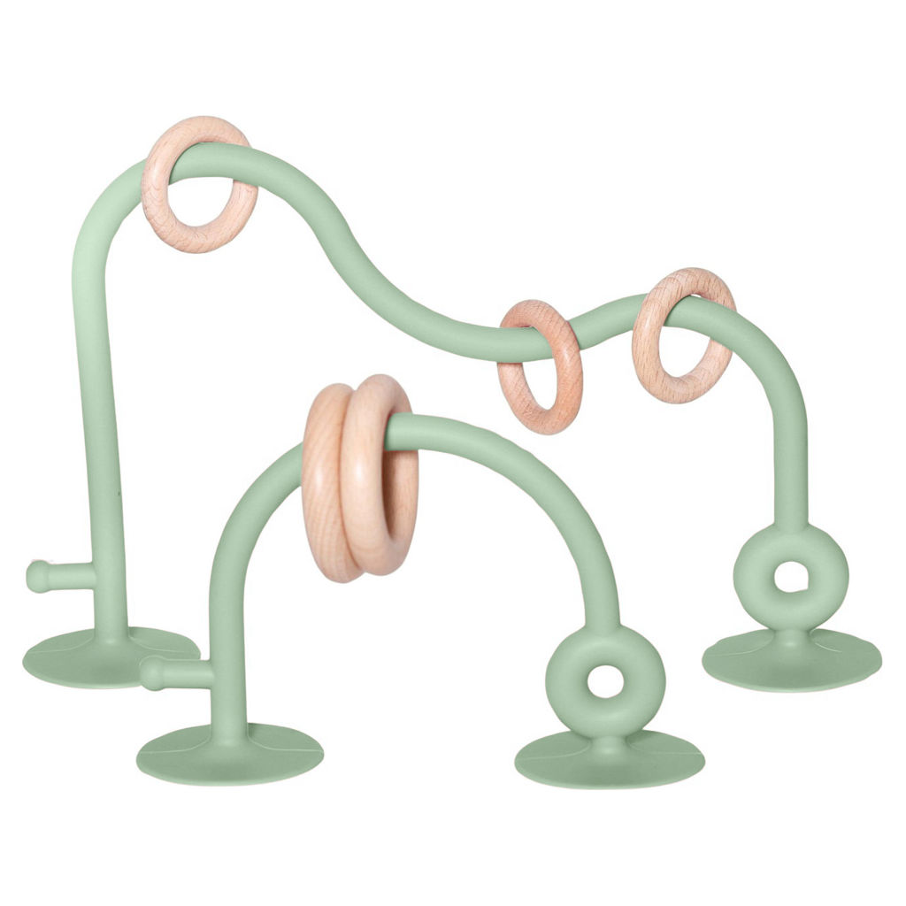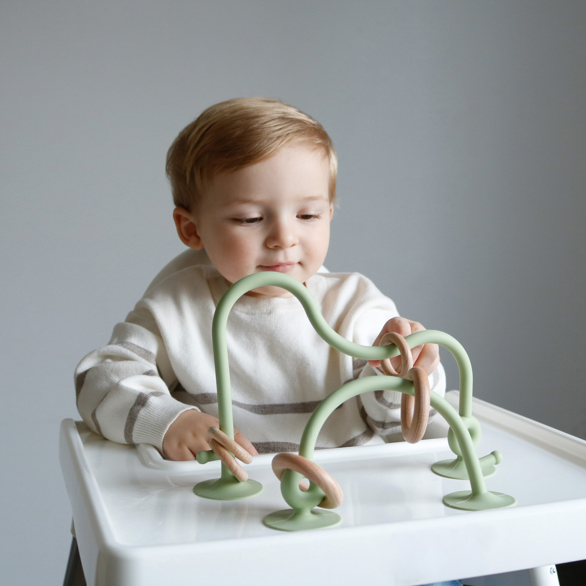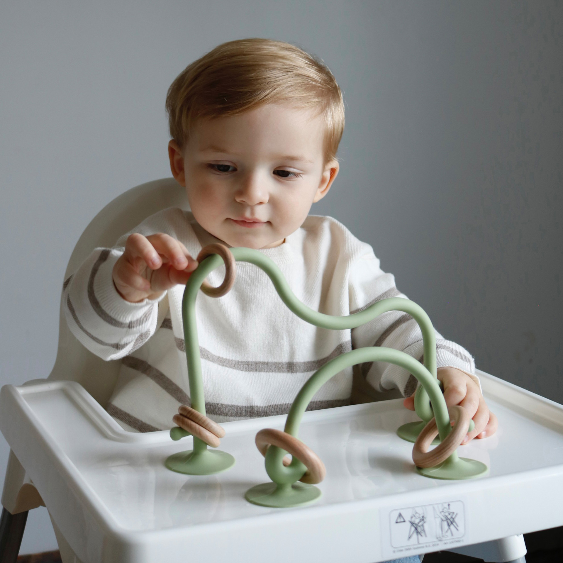 Made from food-grade silicone and beautiful beech wood rings, our High Chair Suction Toy lets your little one explore different textures while developing fine motor skillsand it even helps soothe teething discomfort.