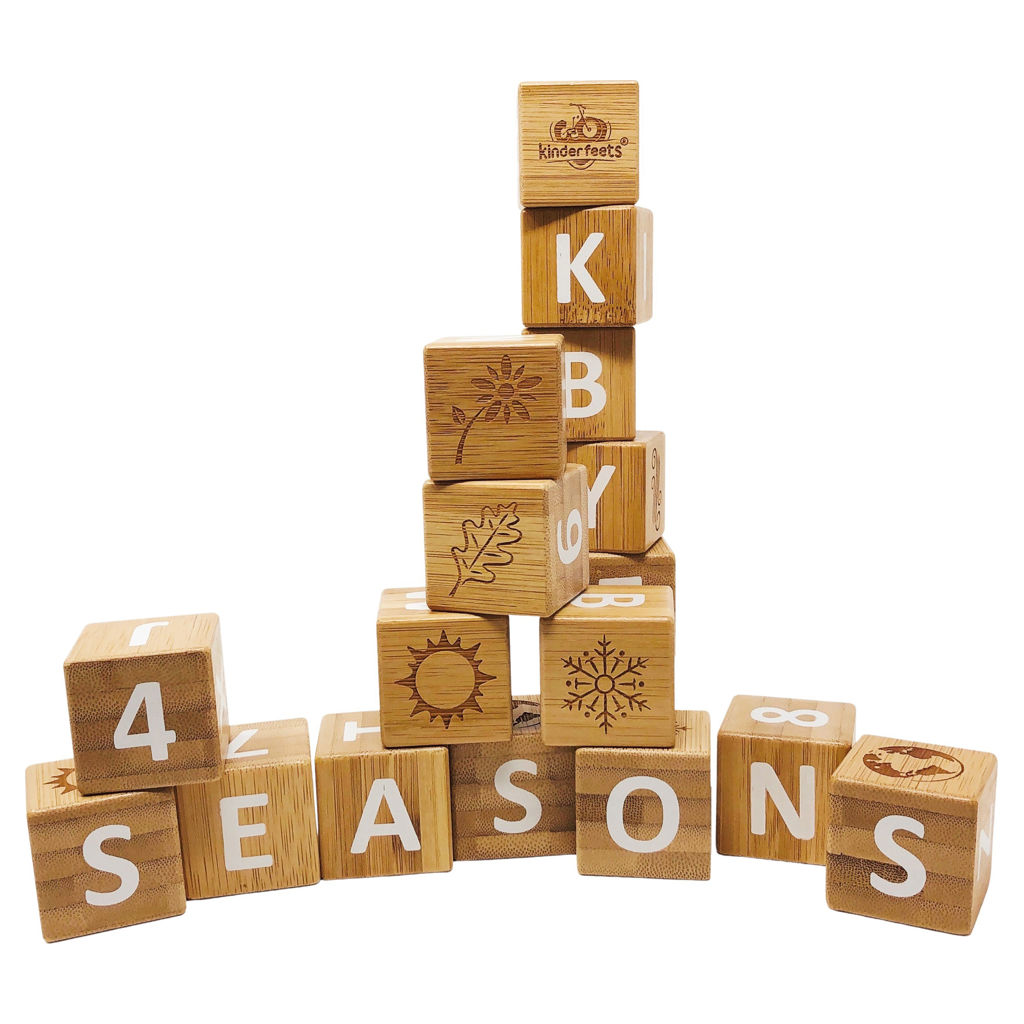 18 bamboo blocks with letters, numbers, 4 elements of the earth and 4 season symbols help children develop their language and communication skills, concentration ability, fine motor skills and hand-eye coordination.