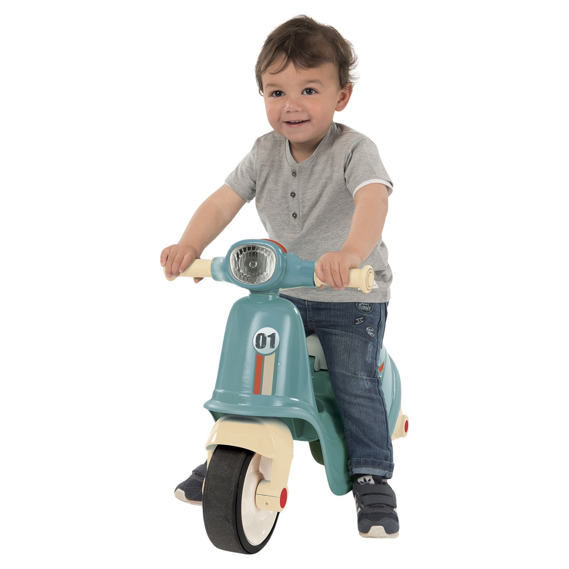 Thanks to its silent wheels, your children will have some fun and walk peacefully! For more realism, the scooter is fitted with a realistic front light, and a mechanical key. After playing, they will tidy their toys up in the toys box placed under the seat!
