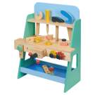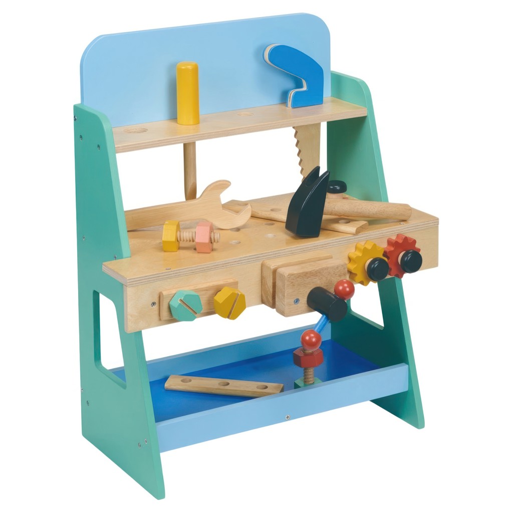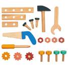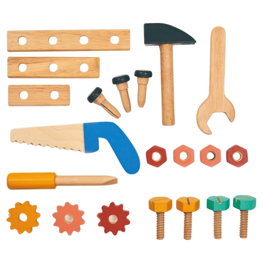 This tabletop wooden tool bench includes a toy hammer, wrench, screwdriver, saw, 4 bolts, 4 nuts, 3 nails, 3 cogs, 3 small planks of wood with holes.
