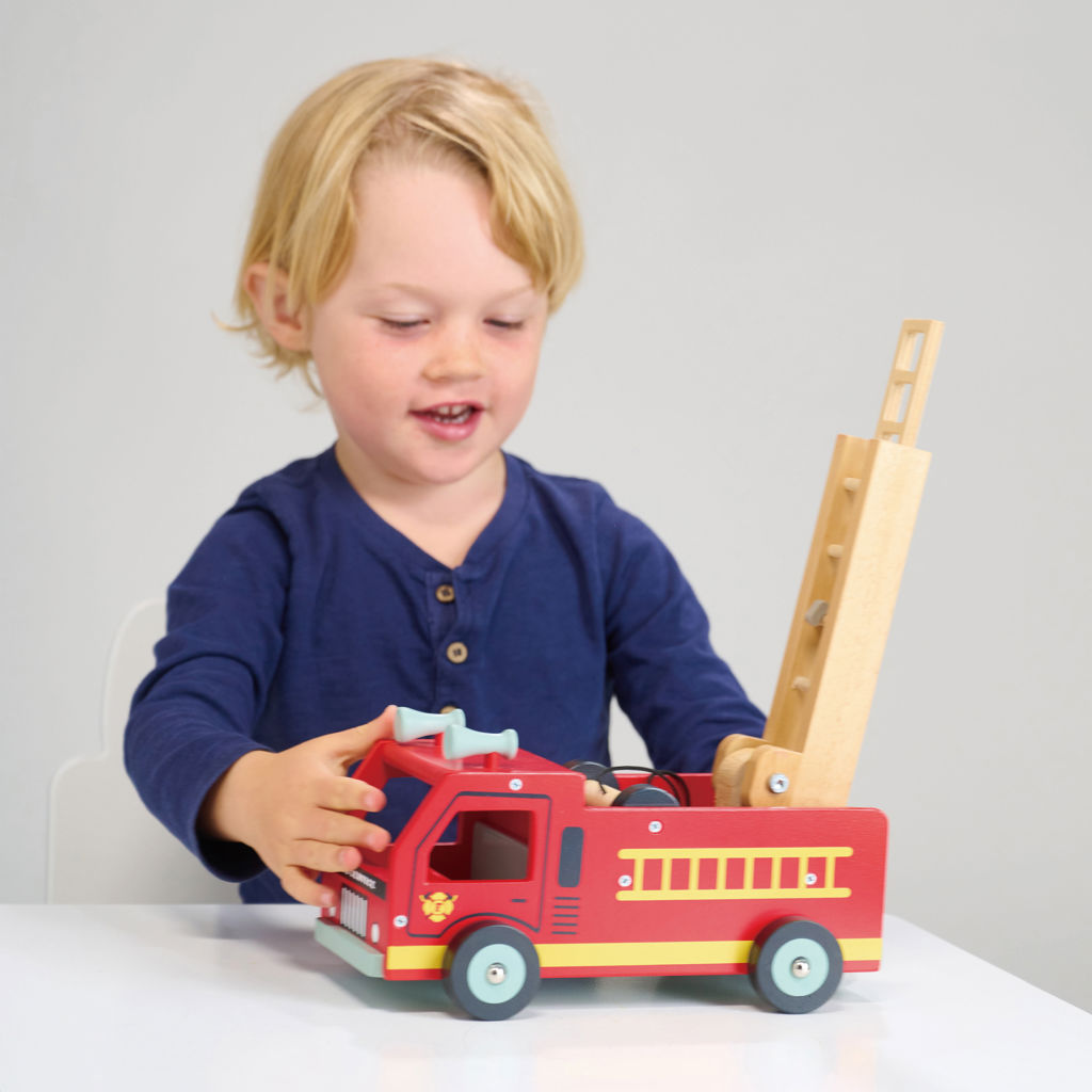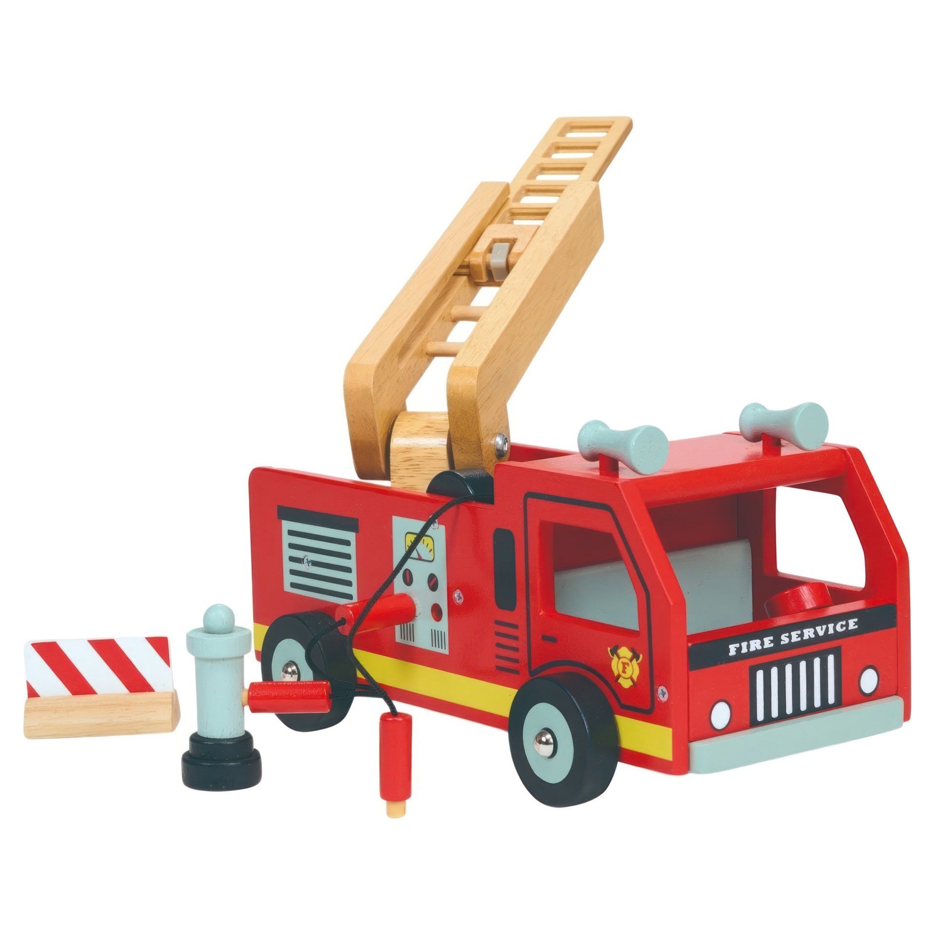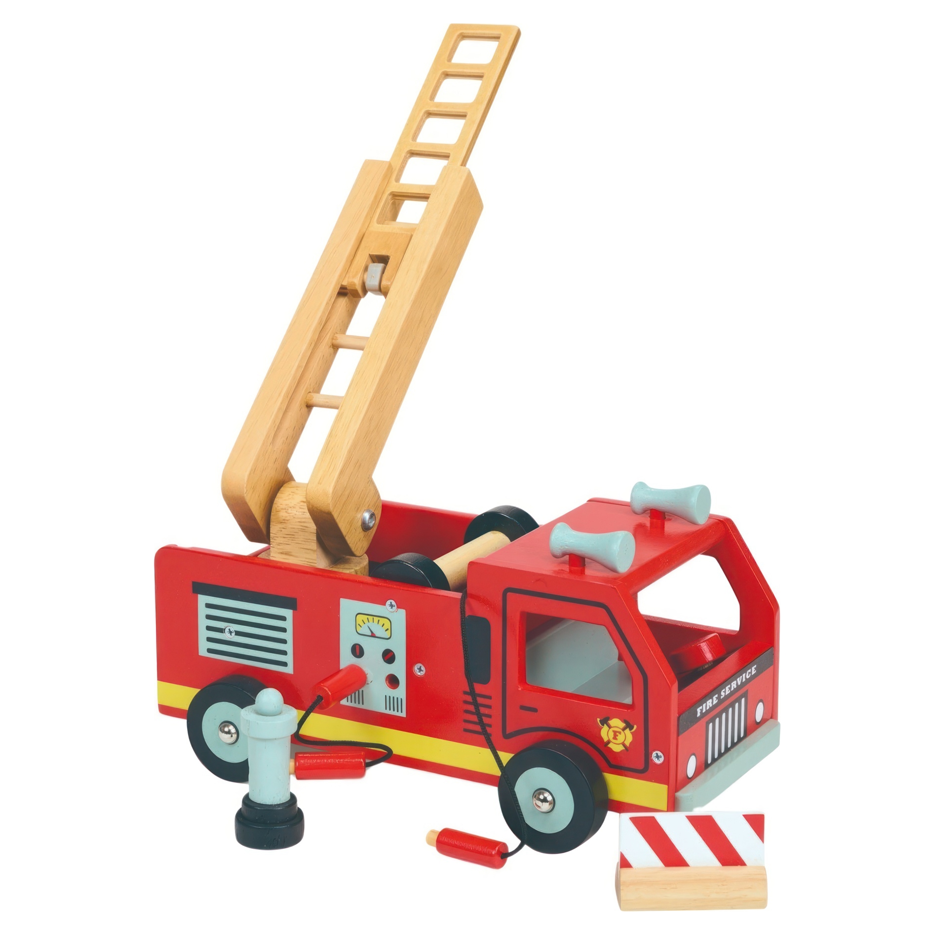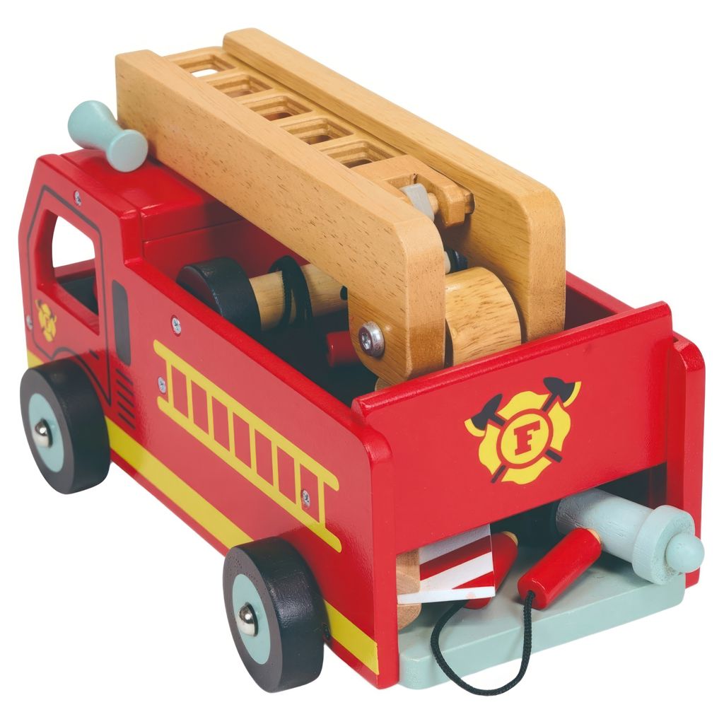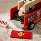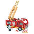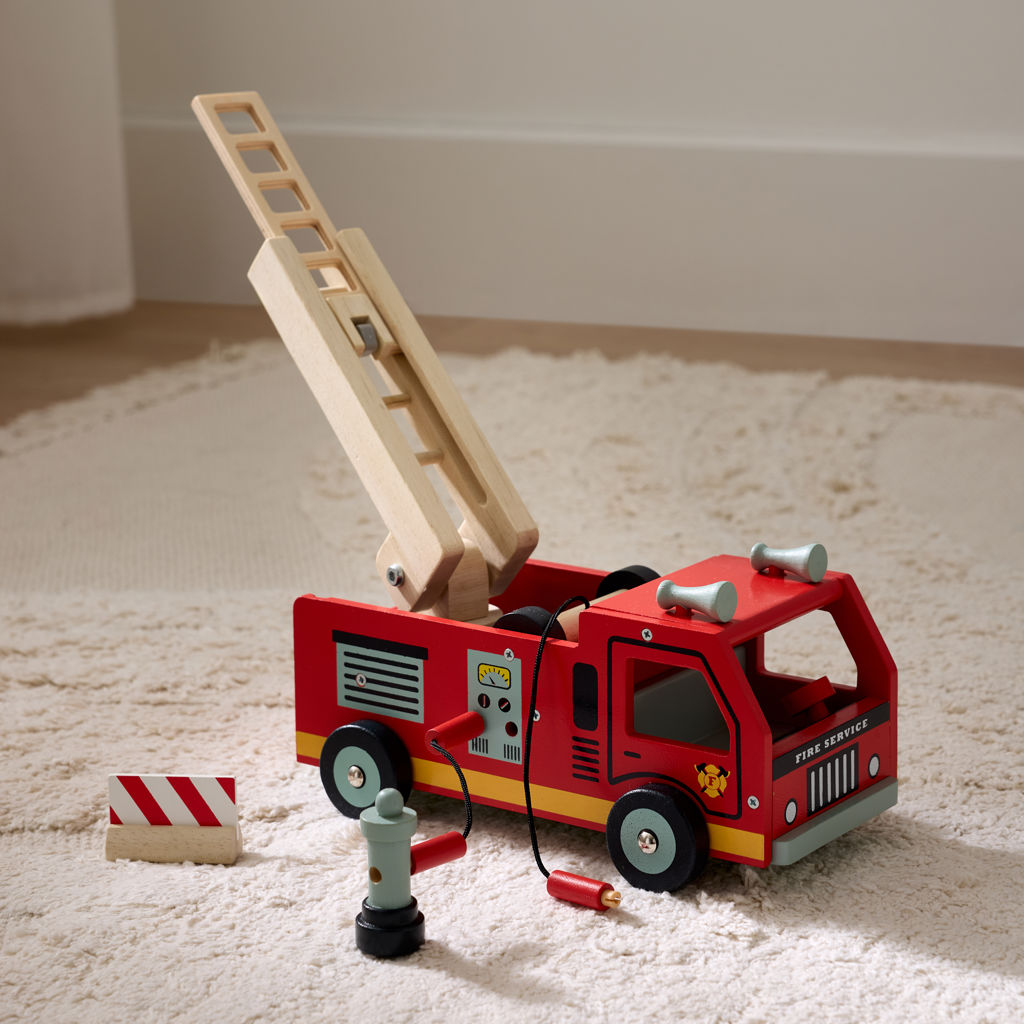This fire engine has an extendible natural wood ladder, a wind up mechanism for the hose cord, and an emergency barrier.