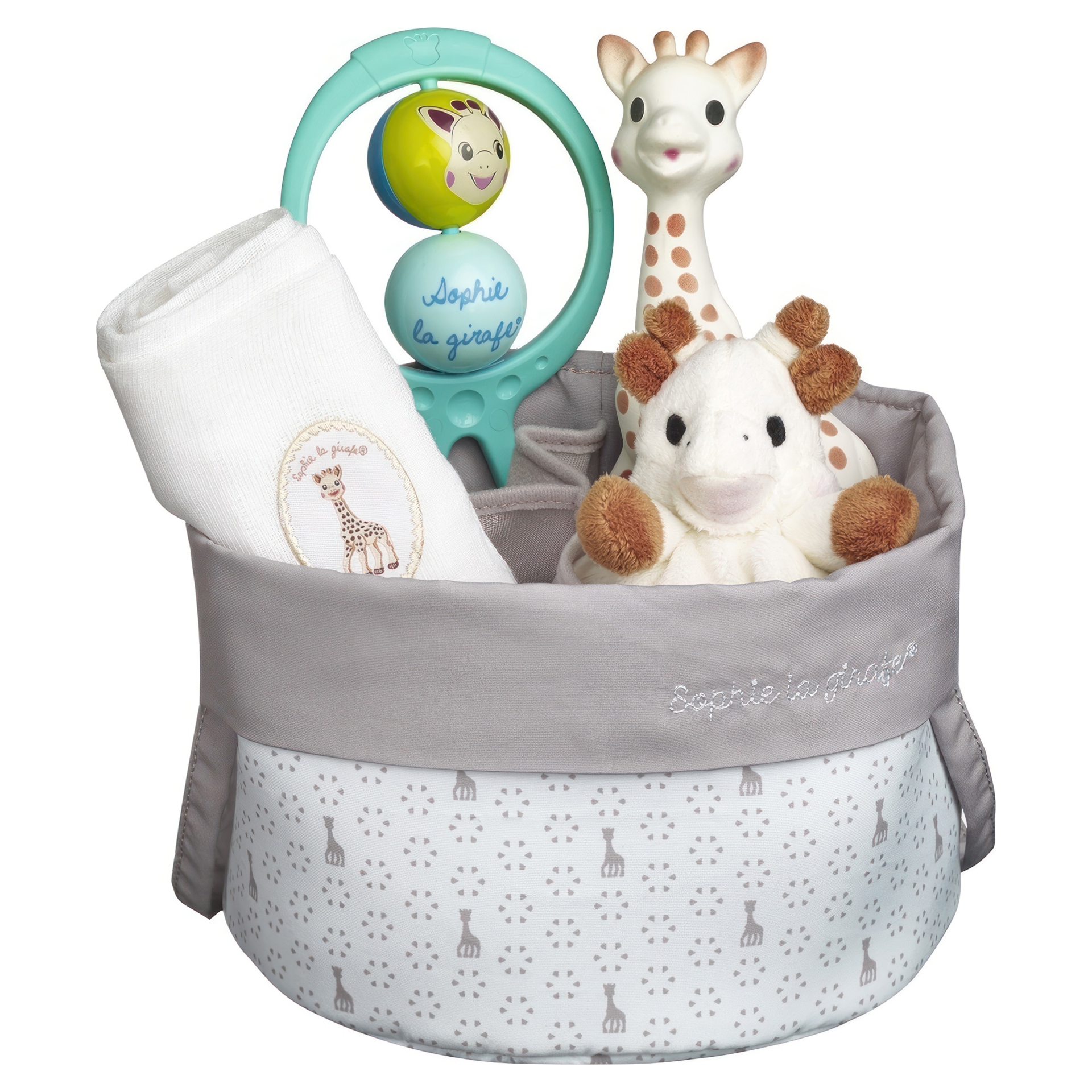 The ideal birth gift including: a basket with handles, Sophie la girafe, a comforter with pacifier holder, a swaddle ( 70x70 cm ) 100 % cotton and a swing rattle.
