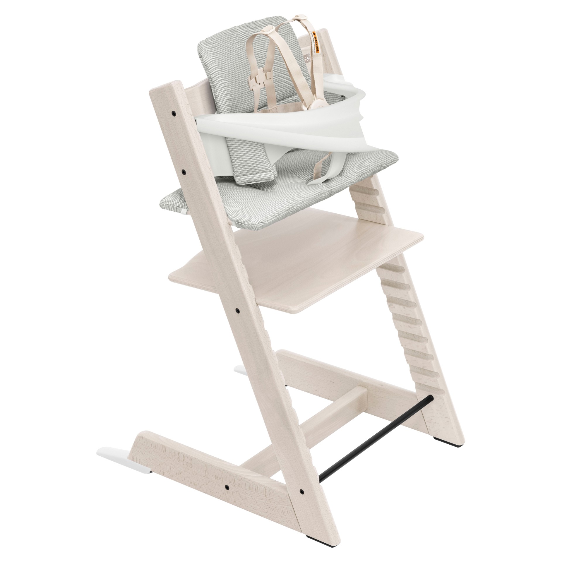 This configuration suits the needs of your child from 6 months to 3 years. Tripp Trapp® Baby Set2 now has a new safe, easy, and intuitive harness buckle, 2 click-in points and a quick, one-click release button.