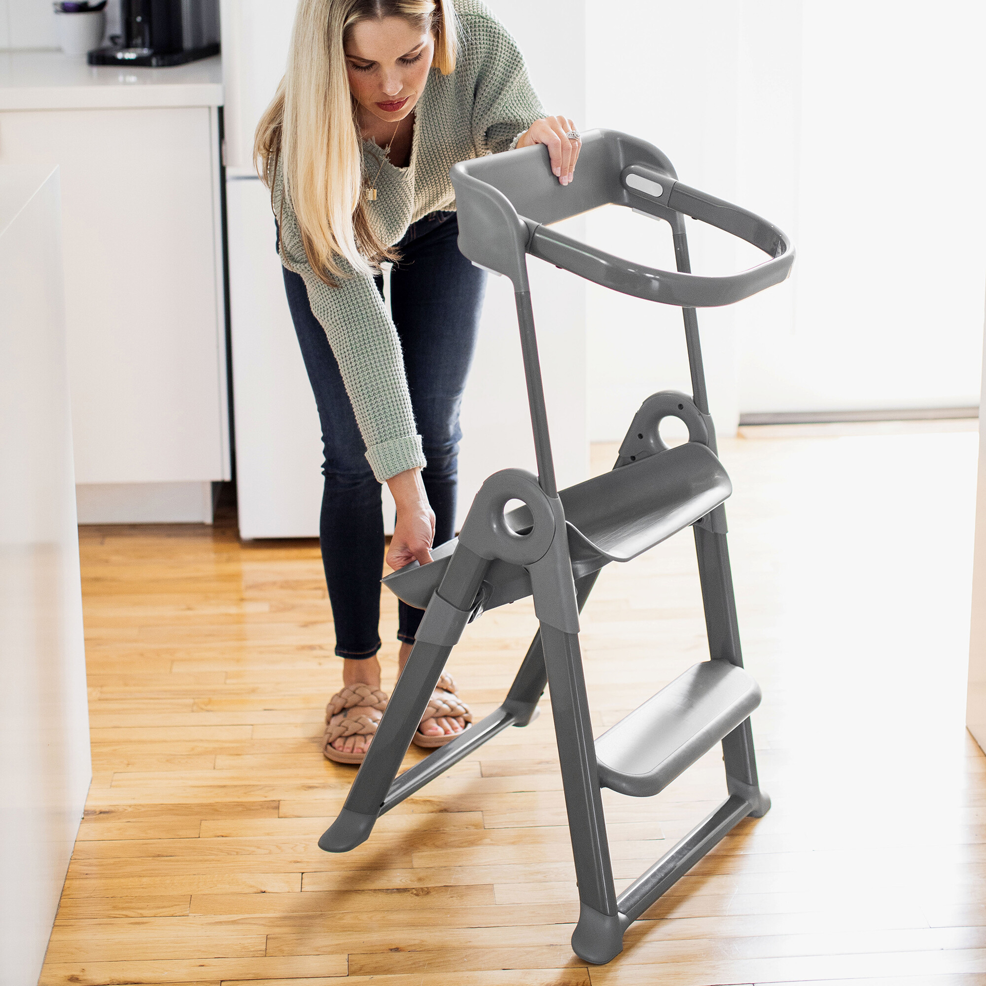 Lightweight and easy to move, this toddler step stool gives kids a boost in both the kitchen and the bathroom