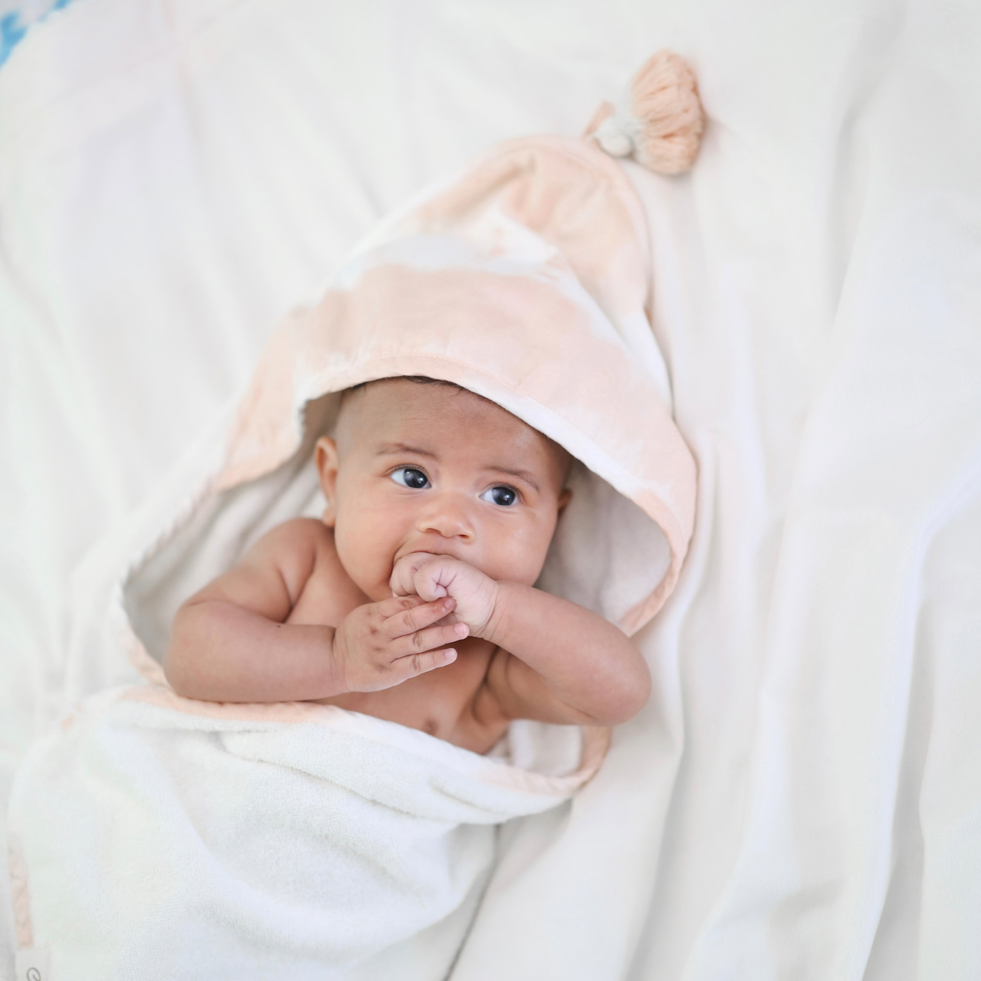Dry baby off in style with this neutral pink and white towel. Carefully designed with baby's comfort in mind, this hooded towel can also coordinate with baby's nursery.