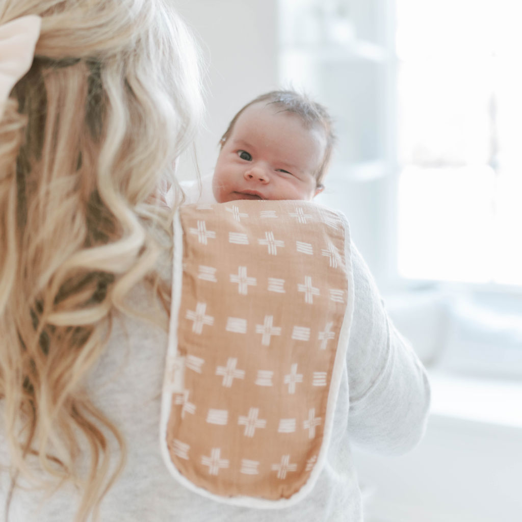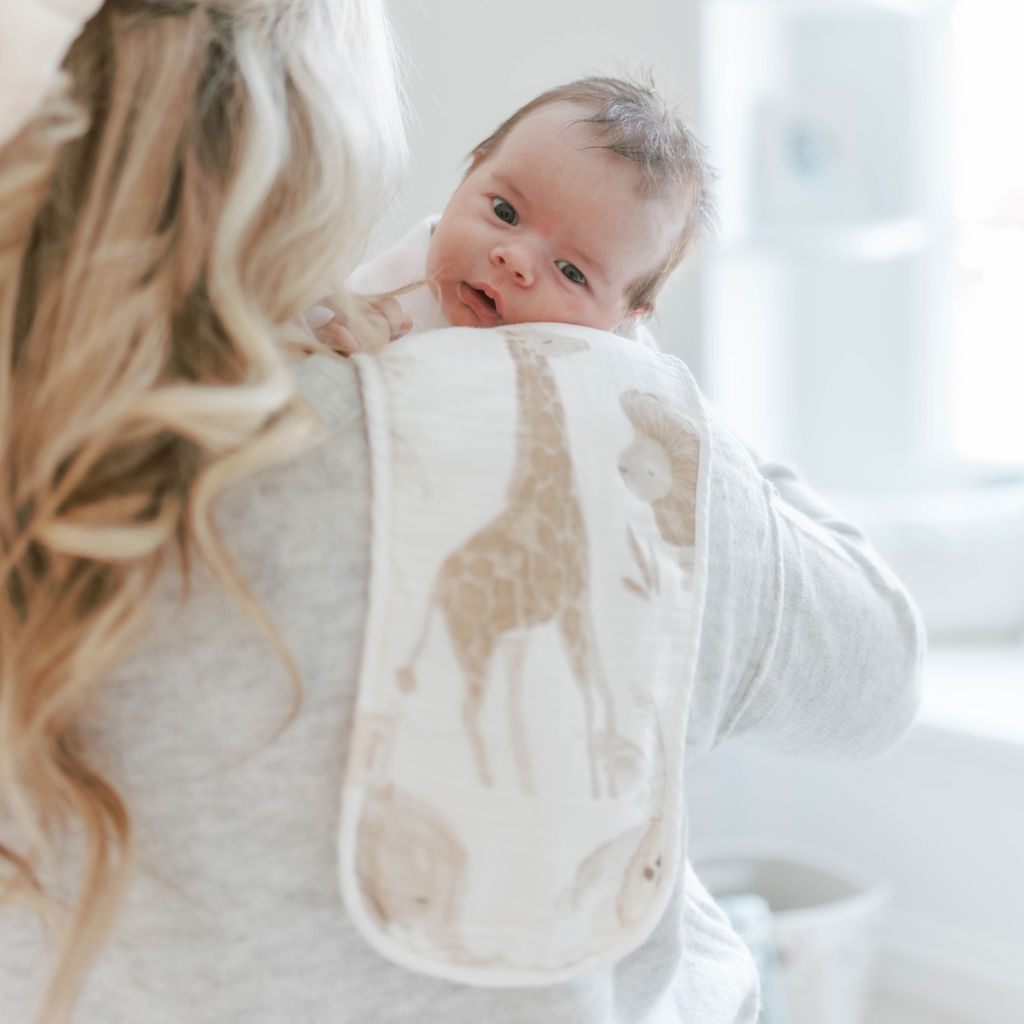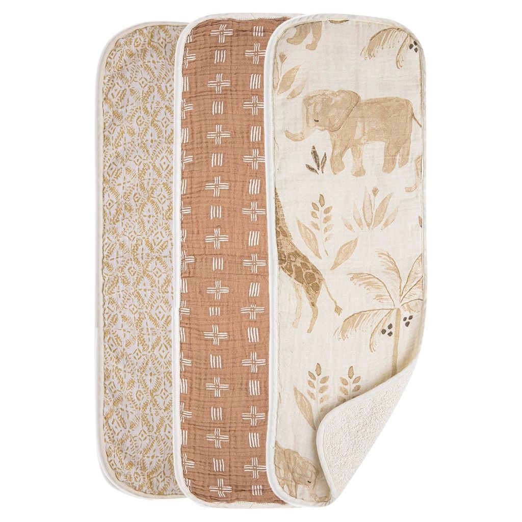 Lightweight and absorbent the 100% cotton Kendi burp cloths featuring a cotton terry cloth back and cotton muslin front are printed to portray the essence of a watercolour we painted in-house. The set includes three unique burp cloth designs.