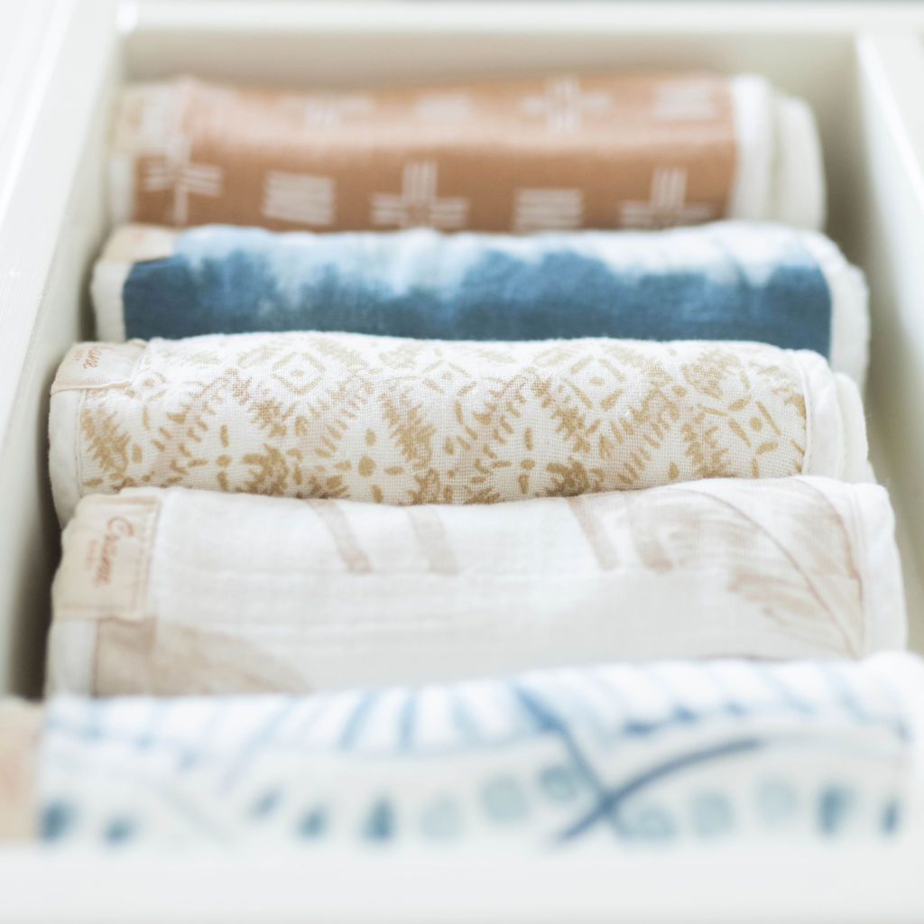 • Lightweight and absorbent Cotton Muslin Front/Cotton Terry Cloth Back
