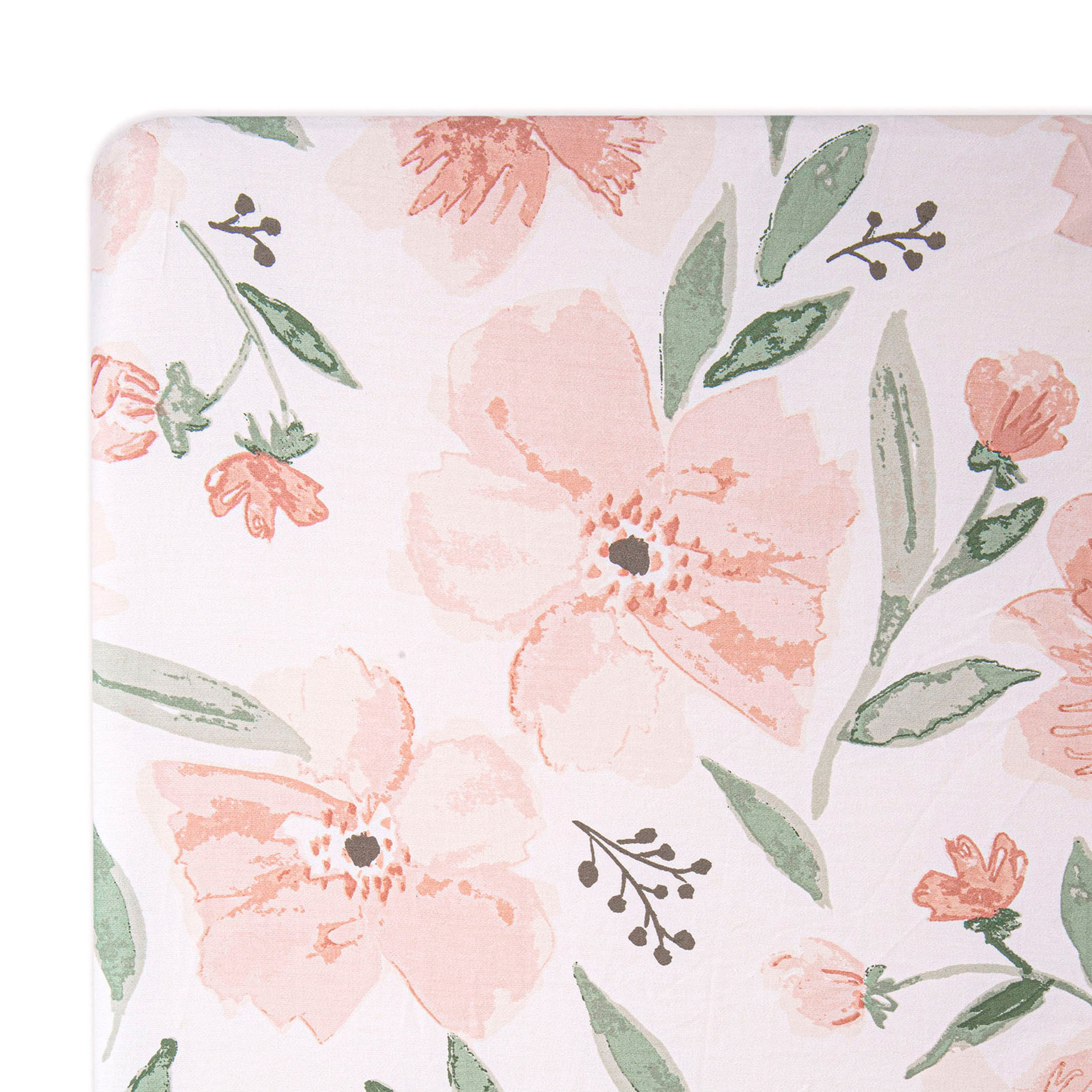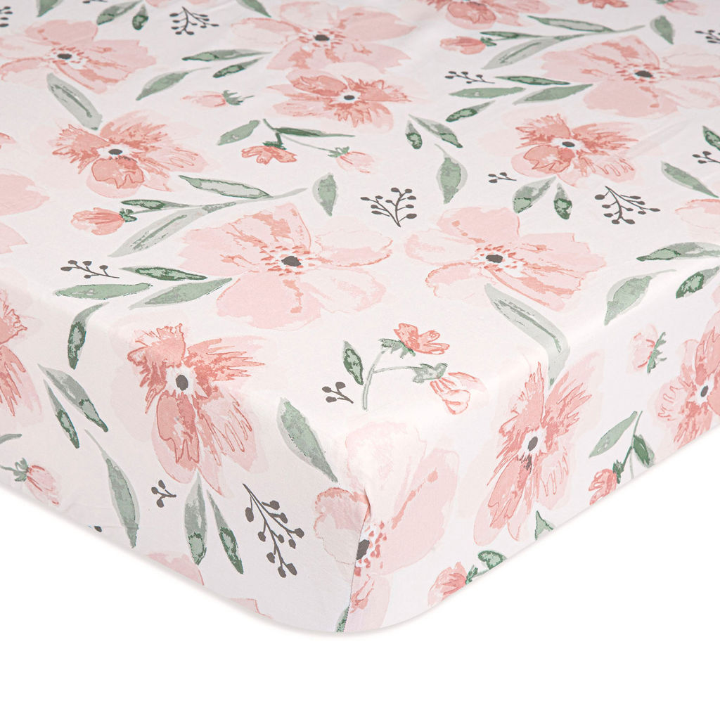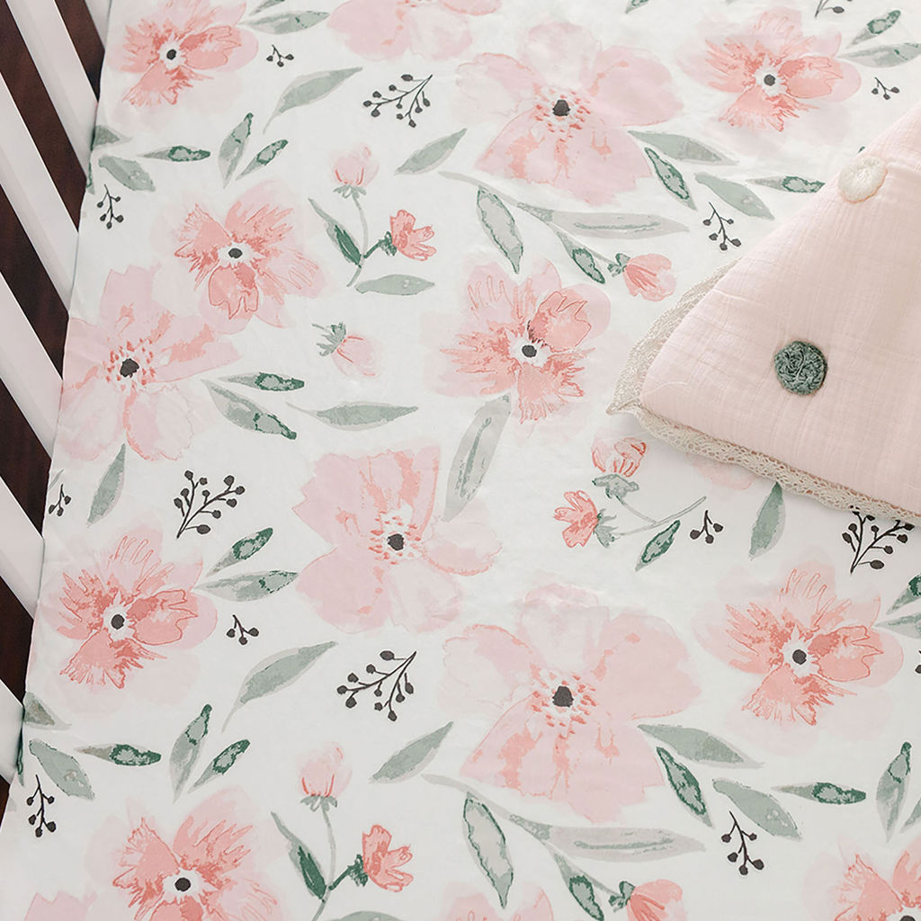 With soft pinks, green and whites, this fitted crib sheet will help add a soft and beautiful touch to any nursery.