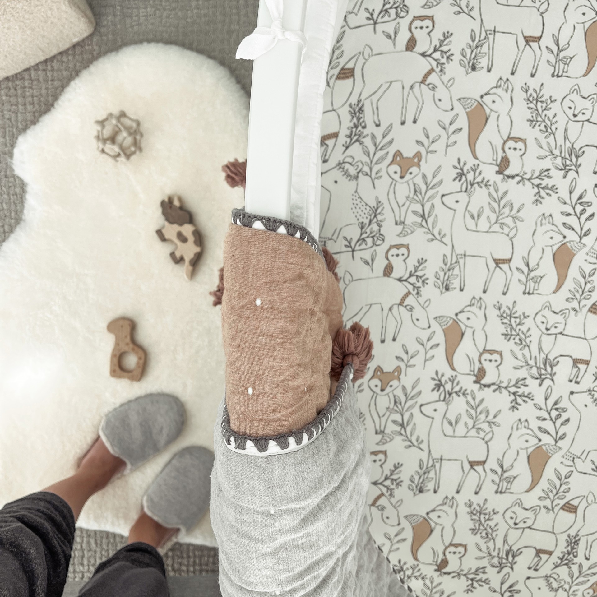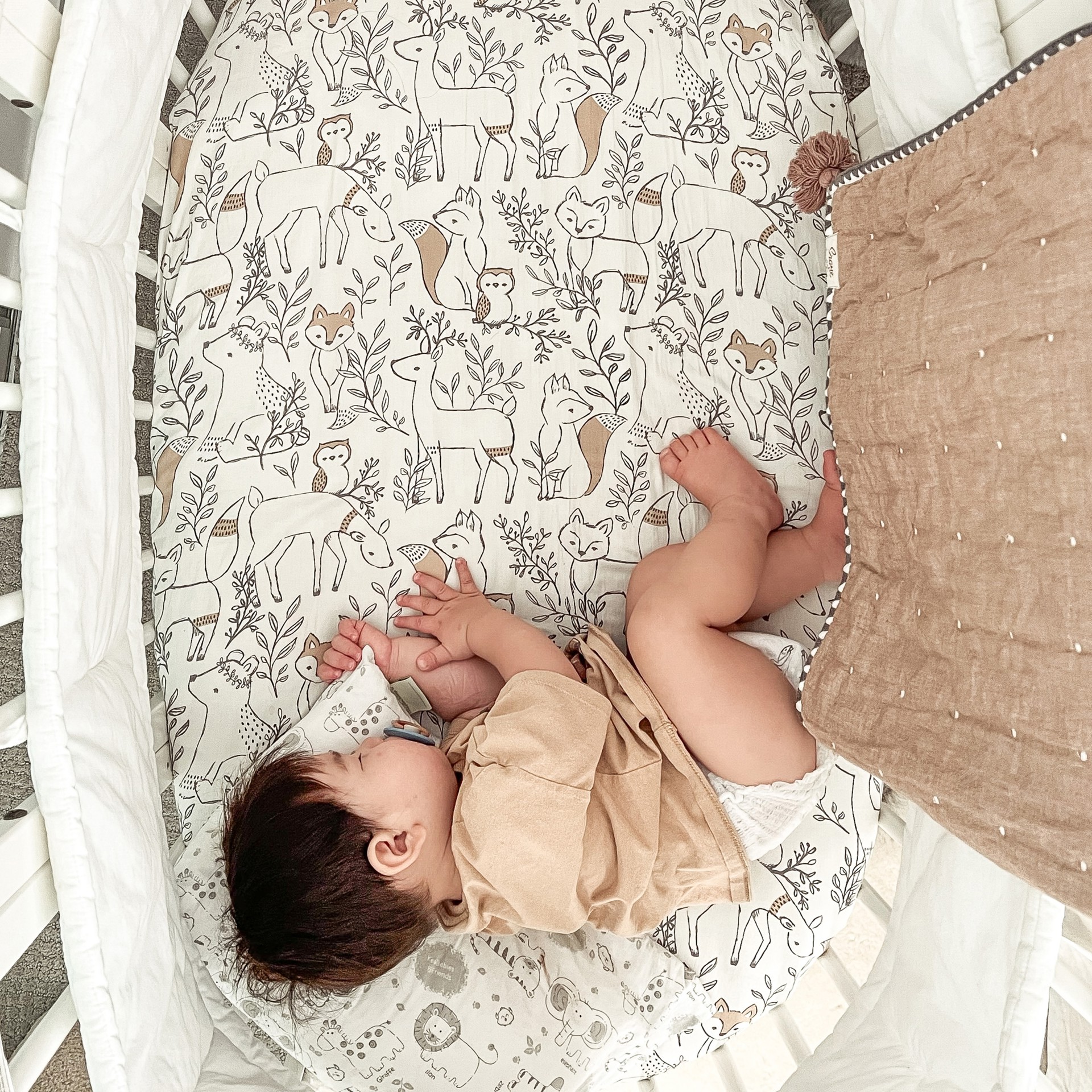 Our Ezra crib sheet features watercolour whimsical woodland animals to complement your nursery style. Baby will be carried off to sleep in their cozy crib sheets that are breathable and soften with every wash. So baby's crib will be their new favourite place!