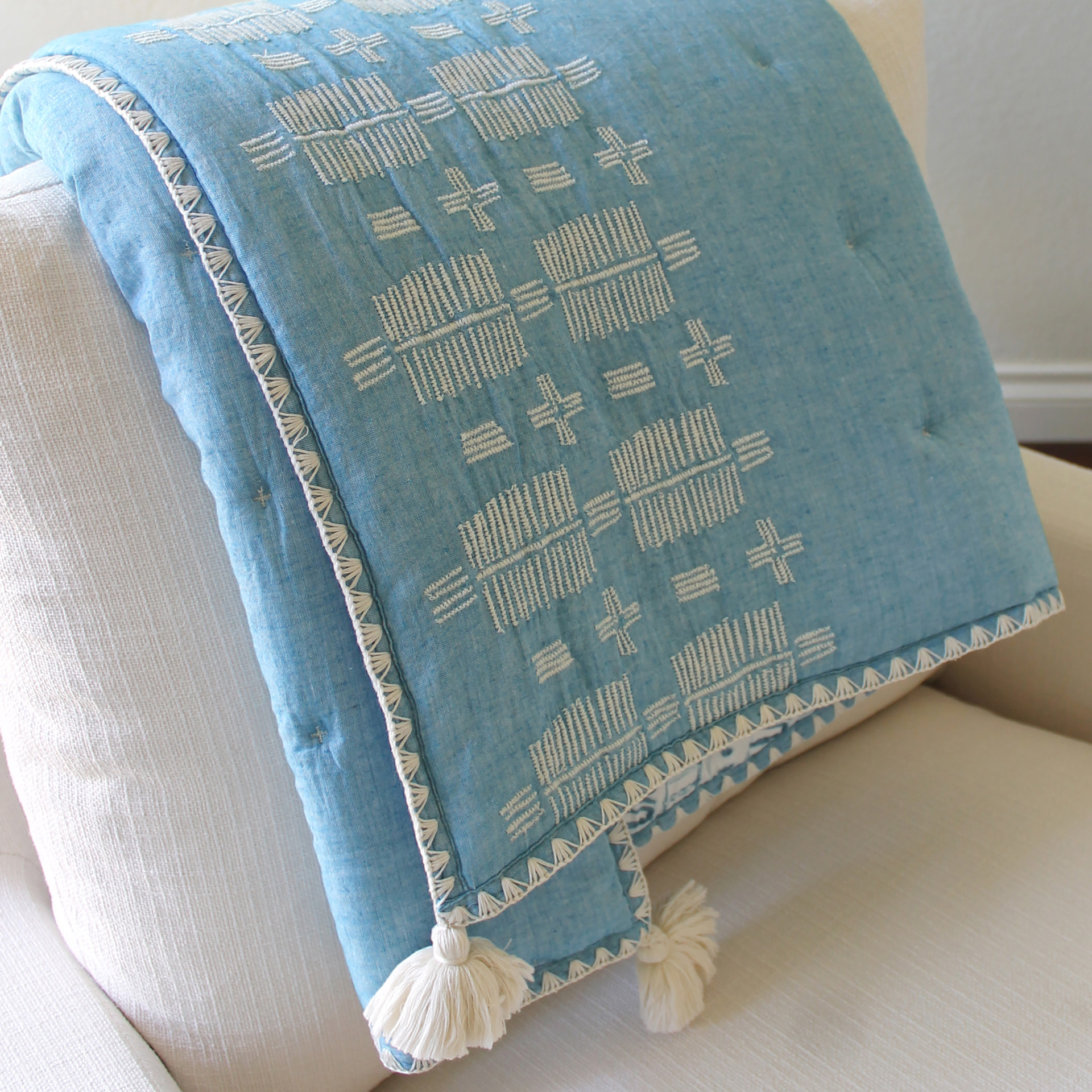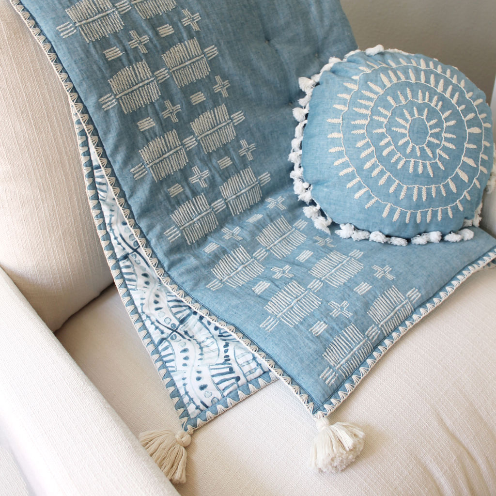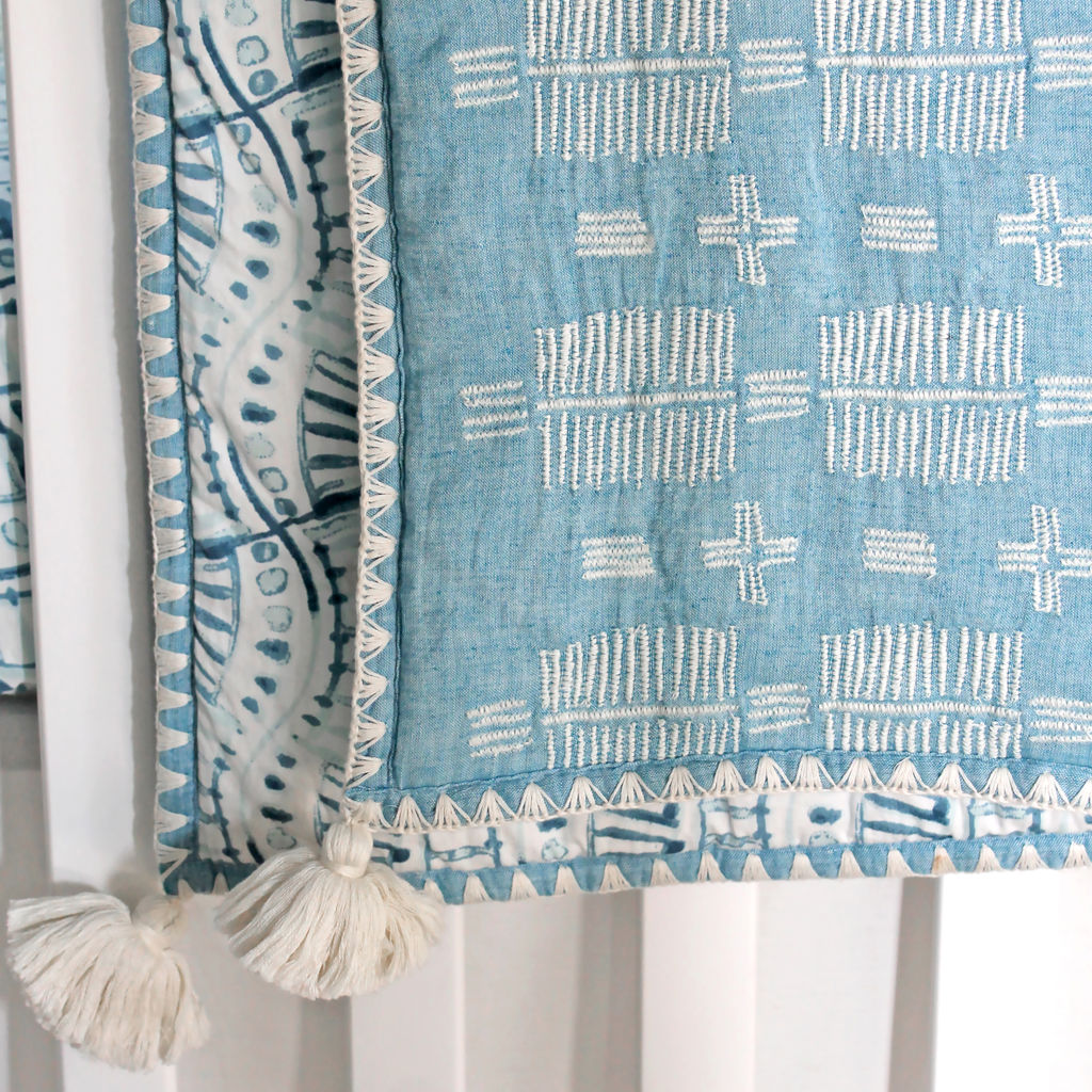 If you love our Caspian Collection, you will love the Caspian Quilted Baby Blanket. It features handmade detailing as well as a palette of peaceful blue shades that will help create a tranquil nursery for baby.
