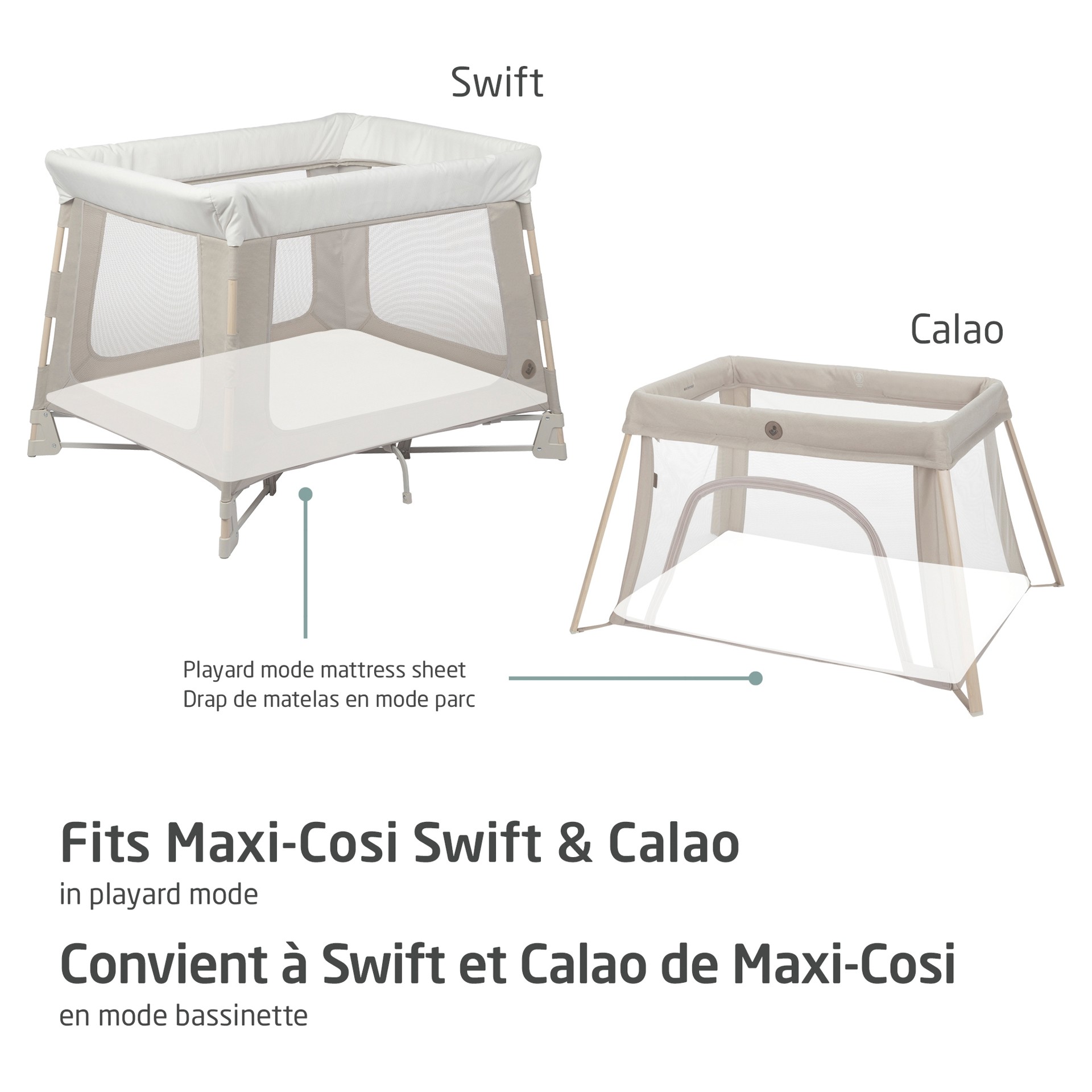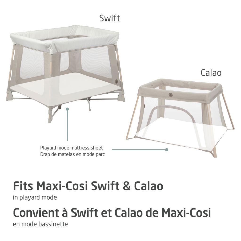Our Maxi-Cosi Swift/Calao Playard Mode Bedsheet is made to fit the playard mattress of the Maxi-Cosi Swift/Calao Playard.