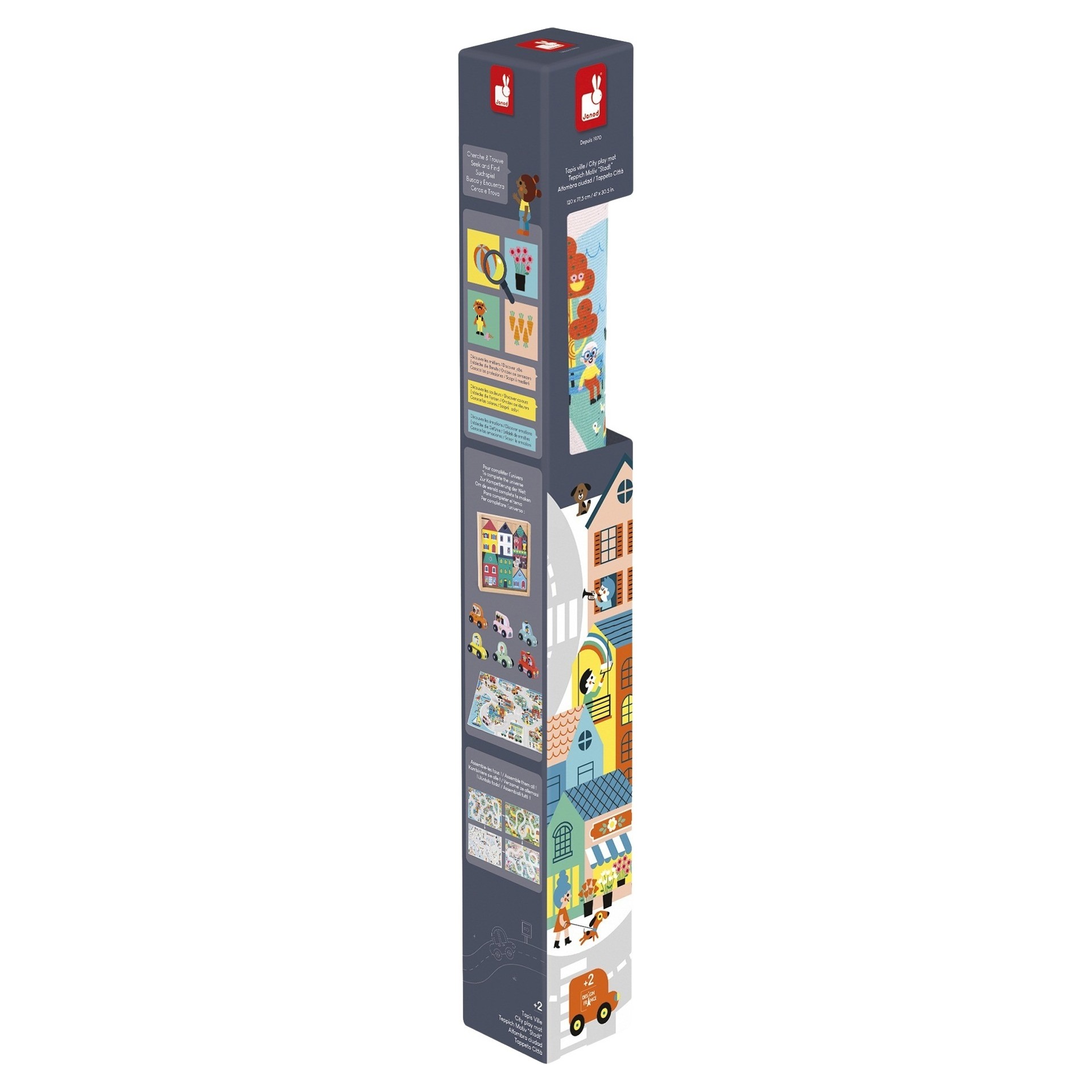 This city-themed playmat boasts a wide and long road map that can be driven to discover each and every neighbourhood and invent countless stories! Besides stimulating the imagination, the mat will help expand vocabulary and can be used for an extensive seek and find game. Can you find the postman?