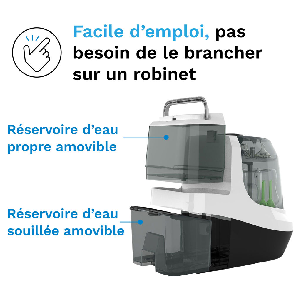 No Sink Hook Up Required and Easy to Use: No messy drain hoses. Includes removable clean and dirty water tanks so you can use anywhere in your house; Built-in wheels for easy turning; LCD Control Panel. Includes replaceable HEPA filter. Universal Capacity: Holds 4 bottles, baby product parts, sippy cups & accessories; Fits virtually all bottles & most baby product parts and sippy cups (excludes wearable baby product parts & straw cups).