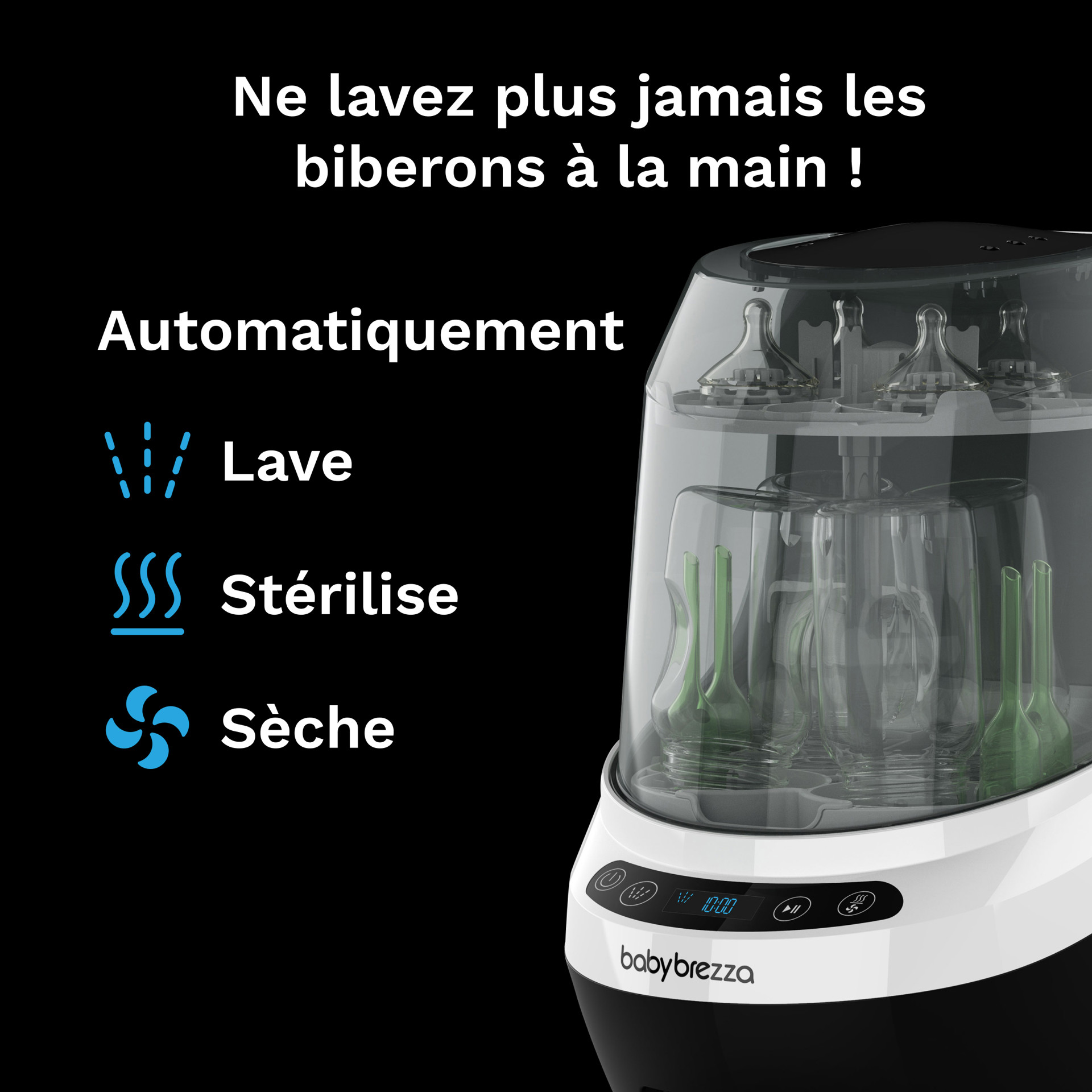 Say goodbye to your bottle brush and drying rack and say hello to the first appliance that automatically washes, sterilizes and dries bottles and accessories at the push of a button!