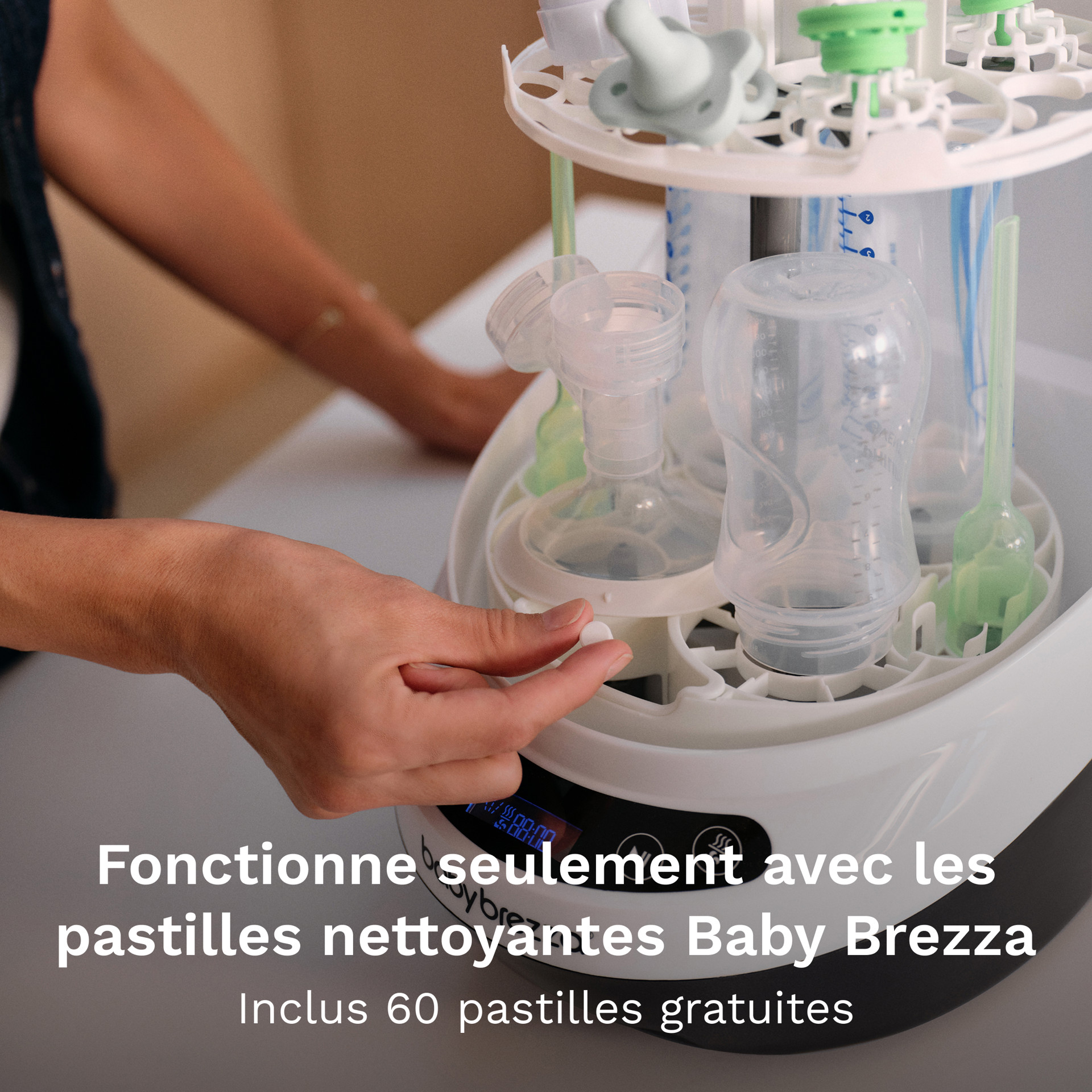 Uses 85% less water than hand washing. 6 Cleaning Modes: Wash, Sterilize & Dry; Wash & Dry; Wash Only; Sterilize & Dry; Sterilize Only; Dry Only. Only use with baby-safe, Baby Brezza Detergent Tablets.