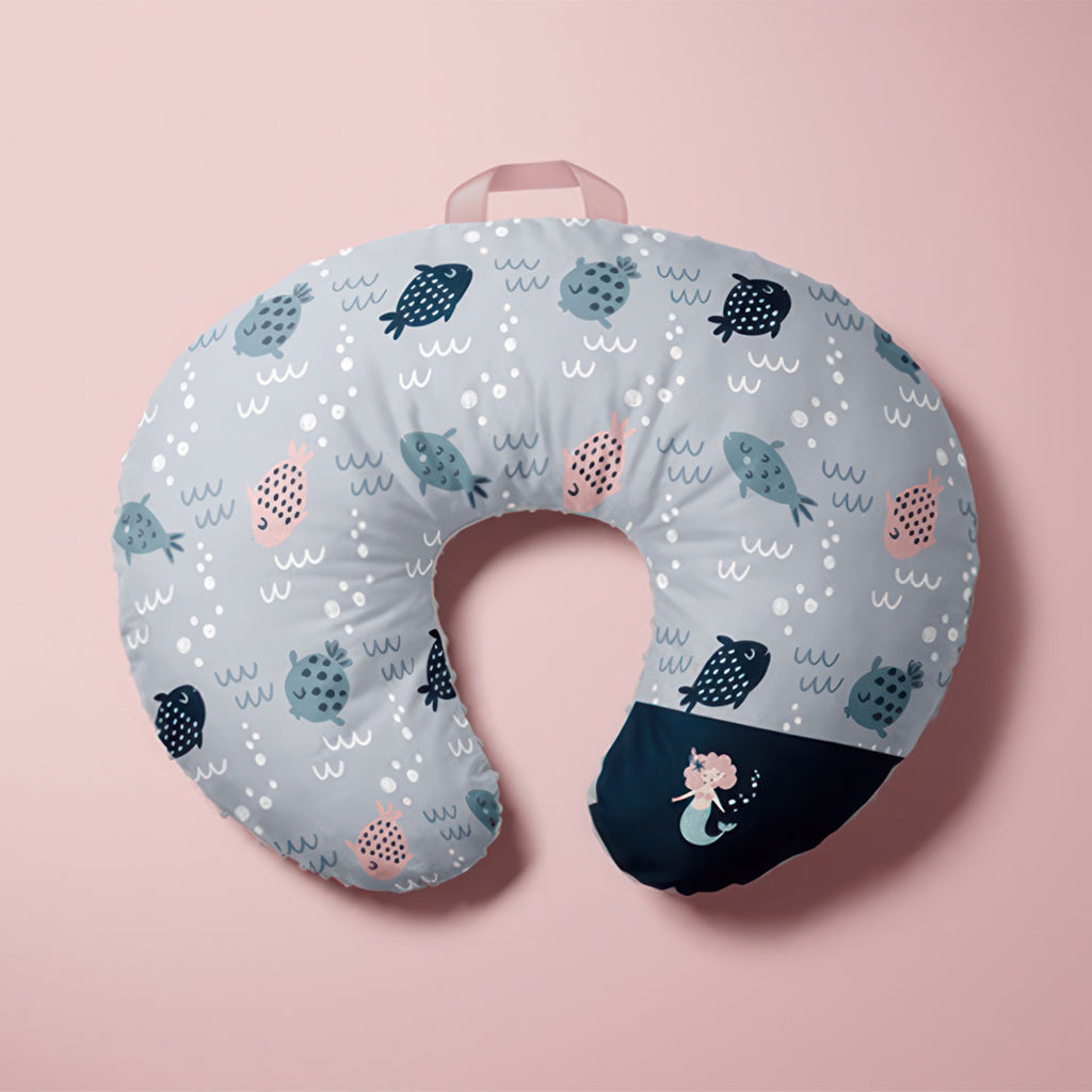 Nursing pillow in UNDER THE OCEAN theme. Made in QUEBEC from eco-friendly fabric. Features a carrying strap, zippered pocket and a removable cover.